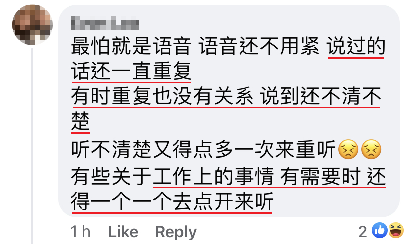 - 有时候是些重要信息,包含数目字、一些专用名词(听不明白,需要写出来才懂是什么)用语音的方式发来,还要我浪费时间一直重复听好几次,然后写下来。