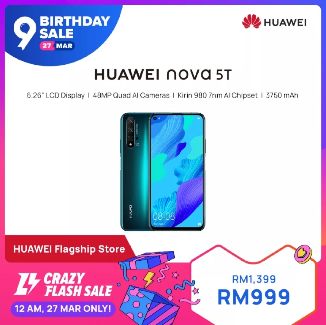 为了配合3月27日 Lazada 9周年庆,各大手机品牌旗舰店及Tech Mall 推出大促销!Huawei 5T 只需RM999,Redmi Note 9 只需RM399!
