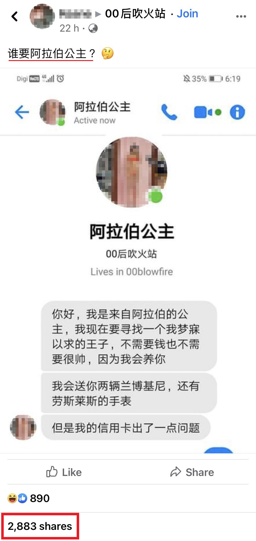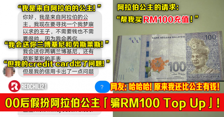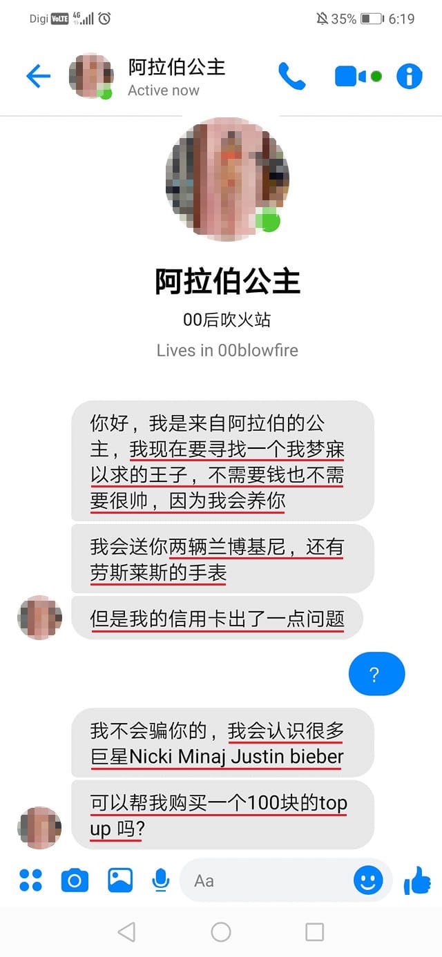 大马网友日前在“00后吹火站”分享一张手机截图,一名同样来自该群组的00后,居然自称是“阿拉伯公主”通过 FB Messenger 私信来骗钱,令人看了啼笑皆非!