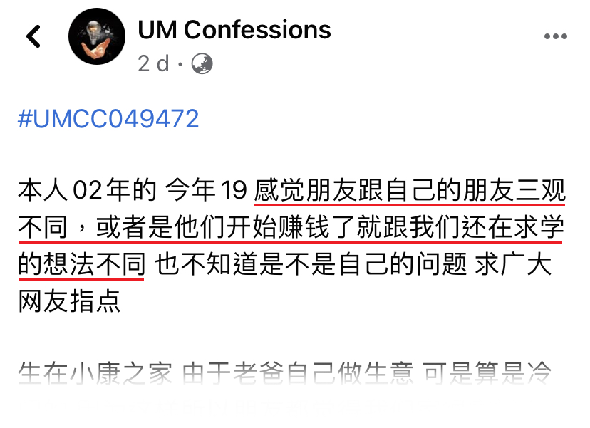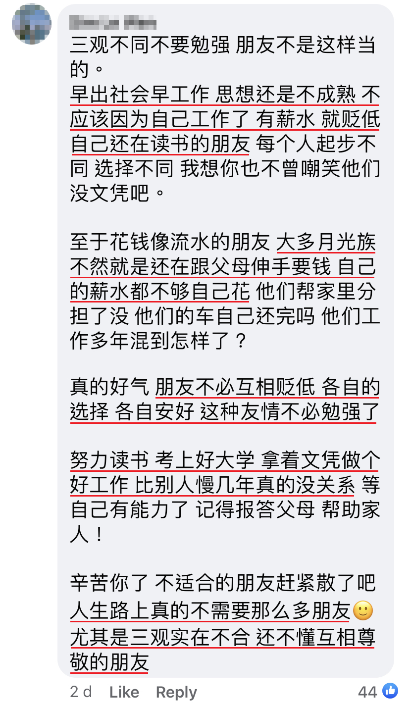 近日一名大马00后男生就表示,发现自己和已经出来赚钱的朋友三观不合,甚至经常被他们酸言酸语,让他听了很难过!