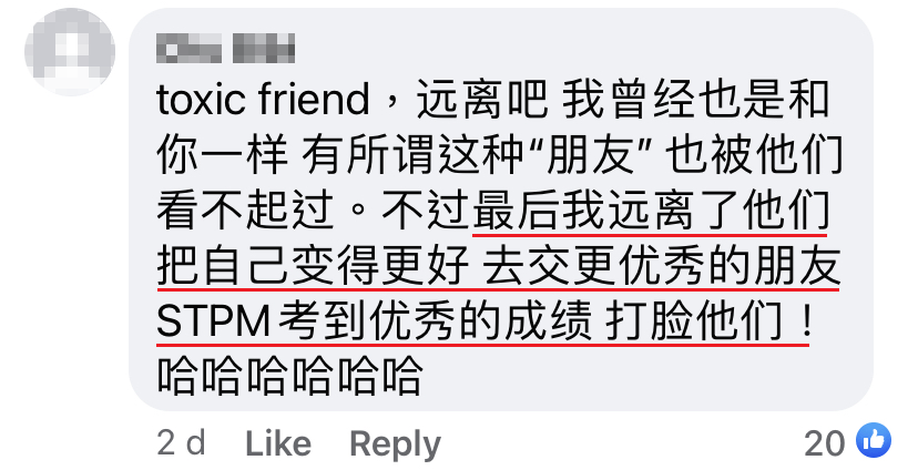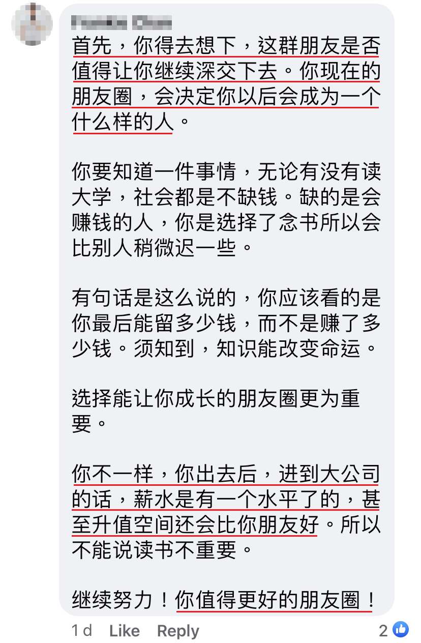 毕业后,我选择STPM继续升学。不出意料,朋友们又来问又来酸小了。他们就问为什么我家那么有钱,不去读私立还是为什么不去找foundation读,要浪费两年去读STPM,还问读STPM有什么用。他们还说他们工作3-4年薪水就会比我们这种大学生还要高,就觉得中学毕业了继续升学很没必要。