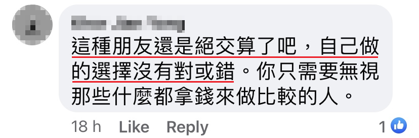 由于家里关于金钱的事情都是父母掌管(零用钱、日常开销),因为我还在读书,没有收入,读书会跟父母拿零用钱。身边已经开始做工的朋友知道这些了,就会讲我们这些人 “妈宝”,讲我们那么大了还要跟父母拿钱什么什么的。