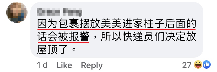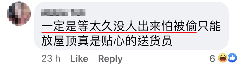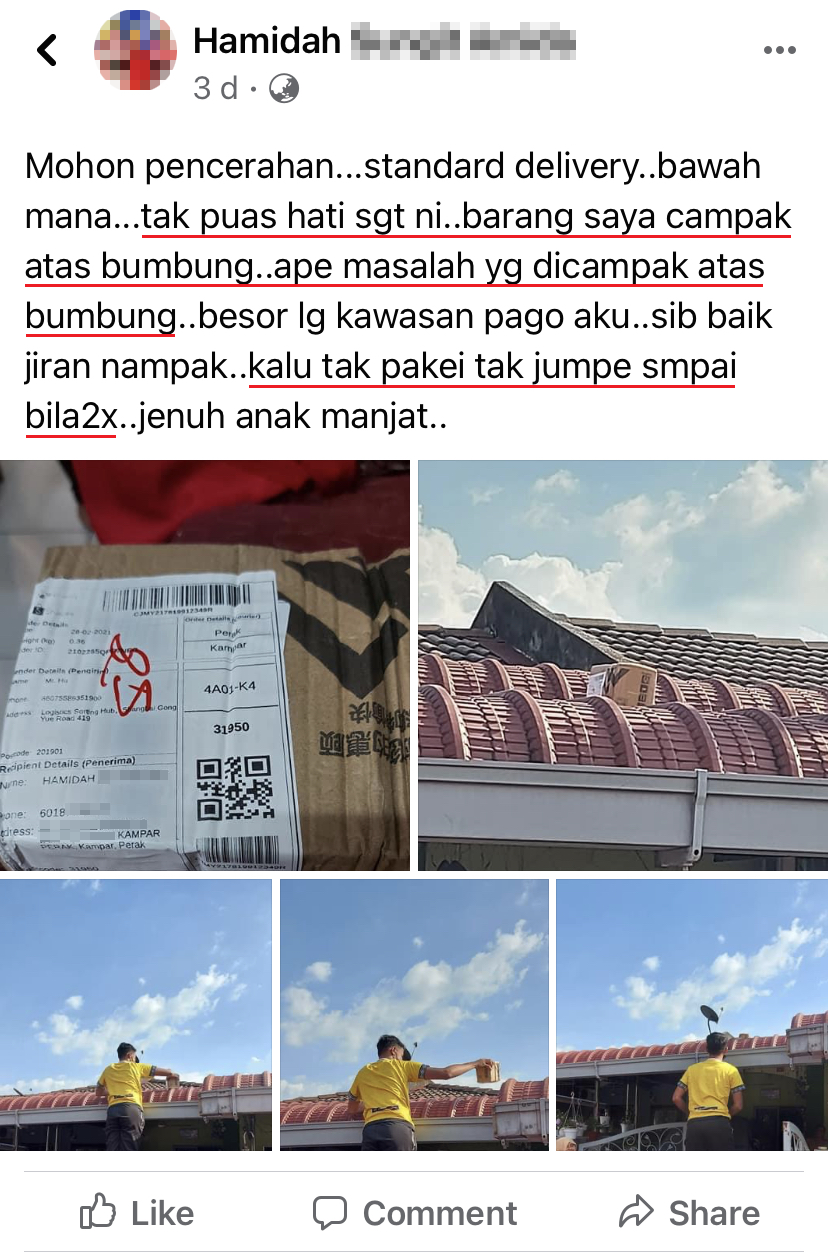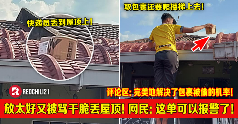 巫裔网友通过脸书发文表示不满,自己的包裹居然被快递员丢到屋顶上!贴主表示:「是有什么有问题吗?!幸好邻居有看到,不然这个包裹什么时候才会被发现?」