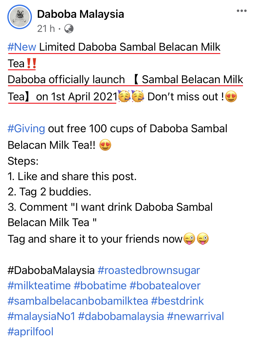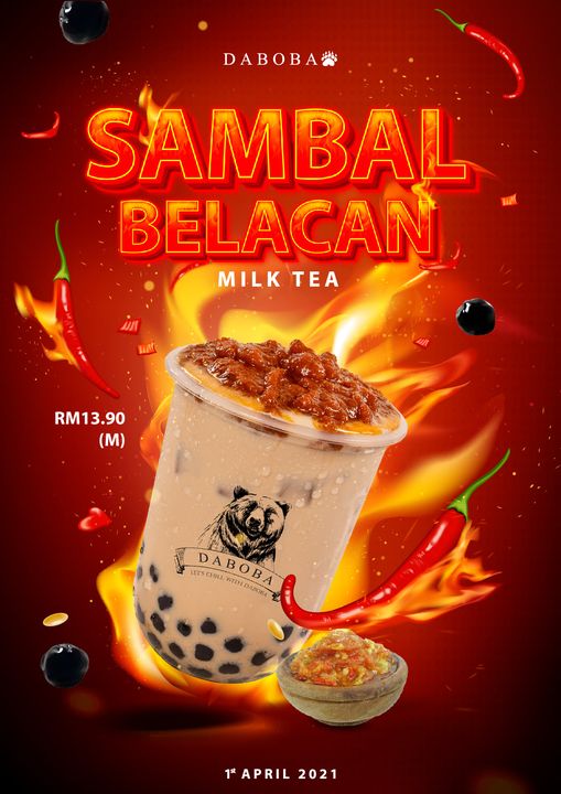 ▼ Sambal Belacan 口味的奶茶!据熊黑堂的官方脸书公布,这款全新口味的奶茶将在4月1日开售,一杯的价格是RM13.90。熊黑堂为此还推出了促销活动,送出100杯 Sambal Belacan 奶茶,民众只需完成指定步骤就可以免费获得!