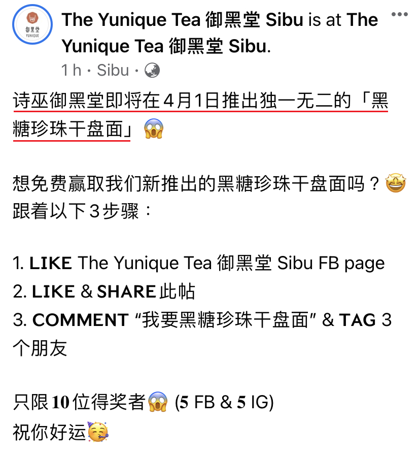 位于砂拉越诗巫的御黑堂分店今天一早在官方脸书发文宣布,由于“干盘面”是最具代表他们本地美食特色的食物之一,于是这家御黑堂分店就发挥创意,推出了“干盘面+黑糖珍珠”!御黑堂同时也推出了抽奖活动,10位幸运儿将免费获得一杯!