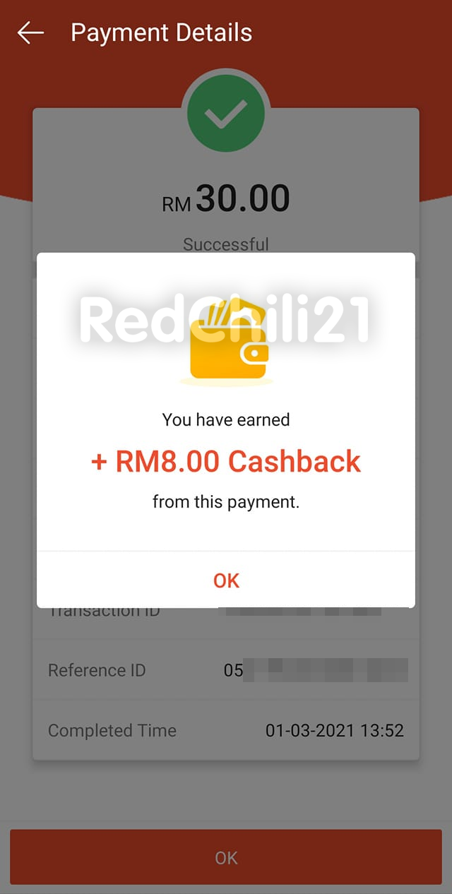 步骤7:你就成功获得RM8 现金回扣,并且将会转进TNG 电子钱包户口内!