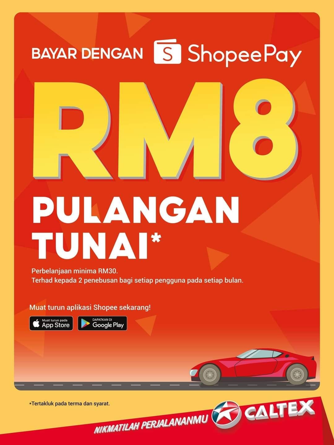 - 在Caltex 油站添油或消费RM30 或以上,并使用ShopeePay 付款可获得RM8 (Petrol/ diesel/ lubricants)