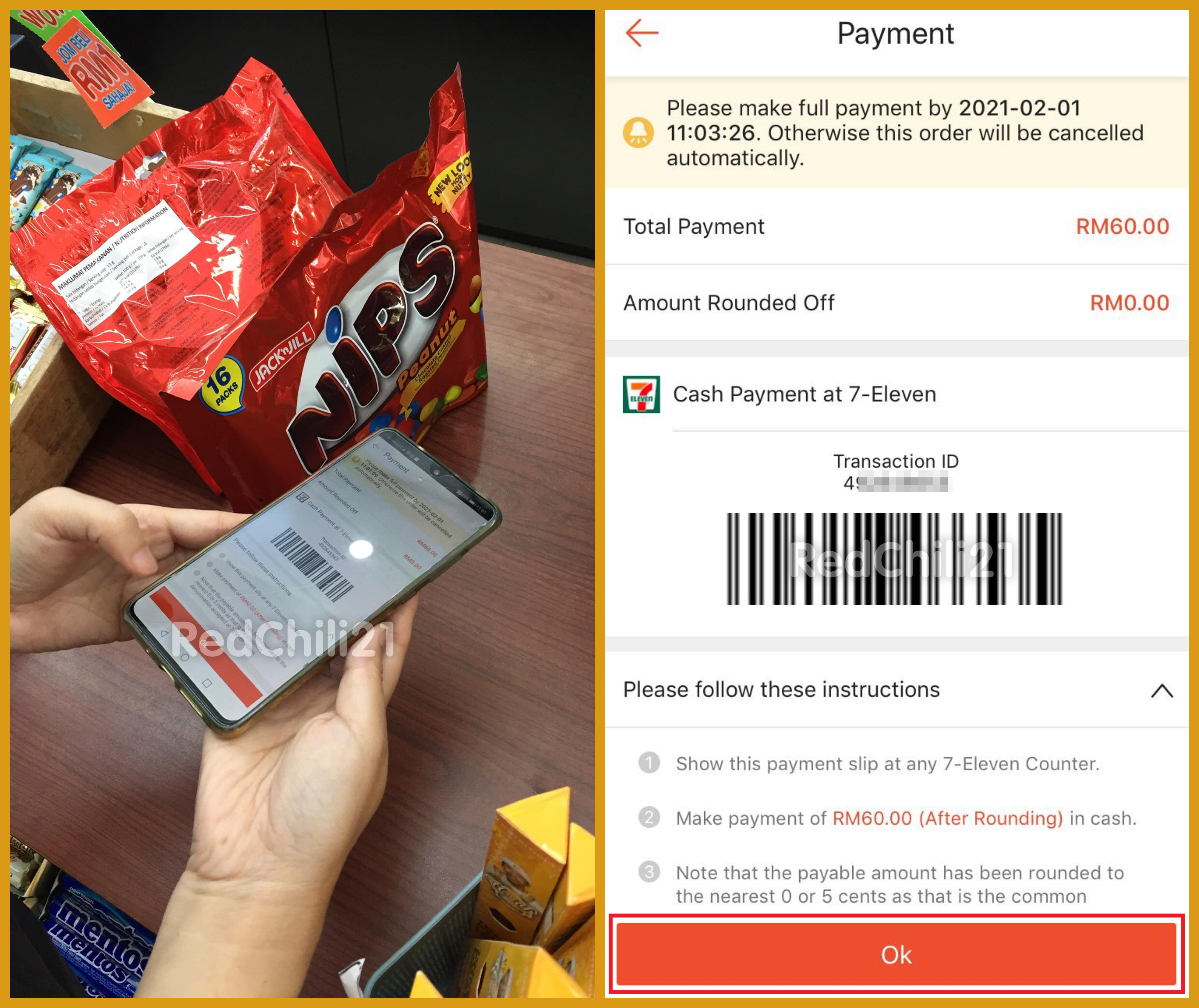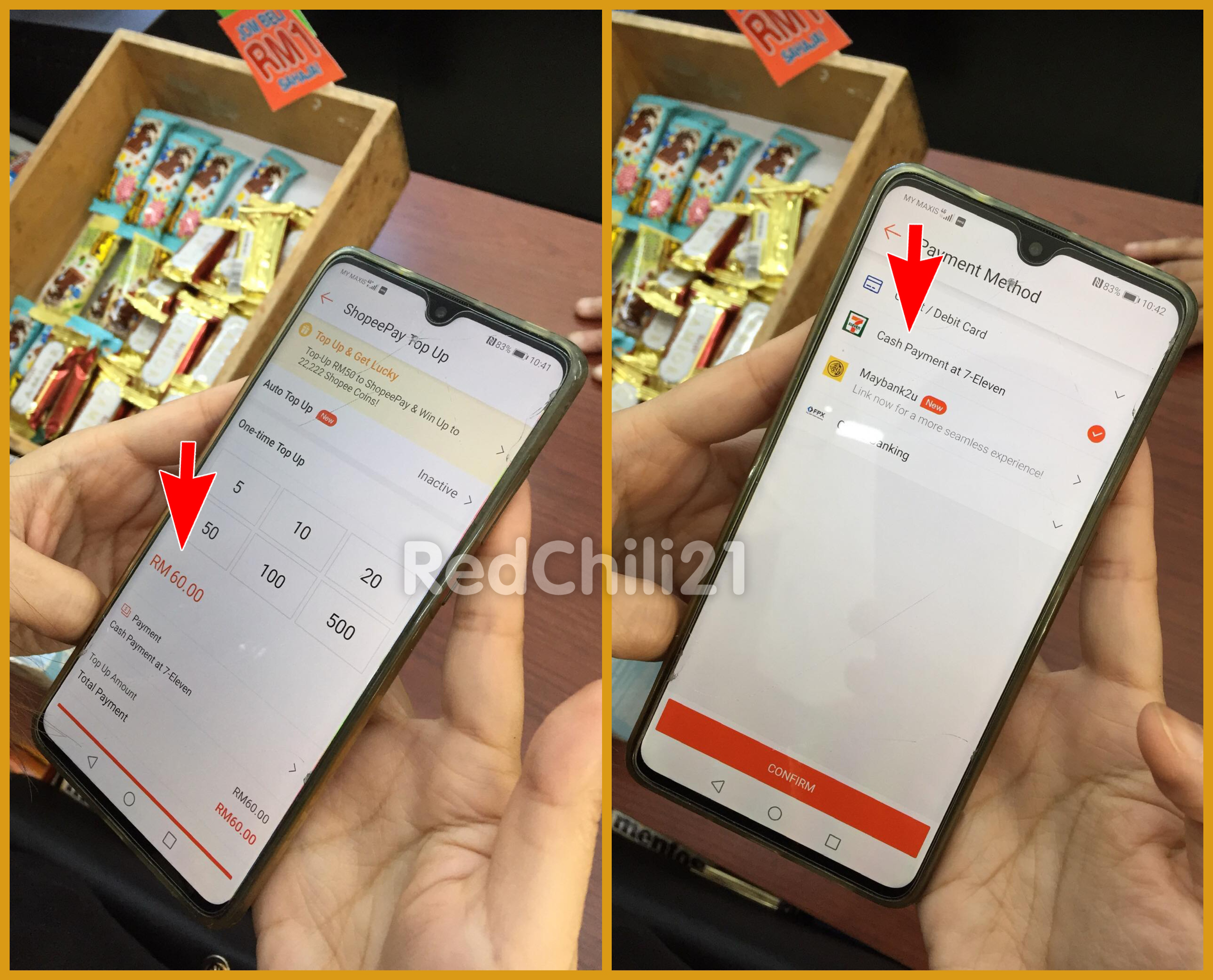 步骤4:到临近的7-Eleven 分店,打开Shopee App 进入充值页面,输入要充值的数额RM60。然后选择「Cash Payment 7-Eleven」,点击「Confirm」。