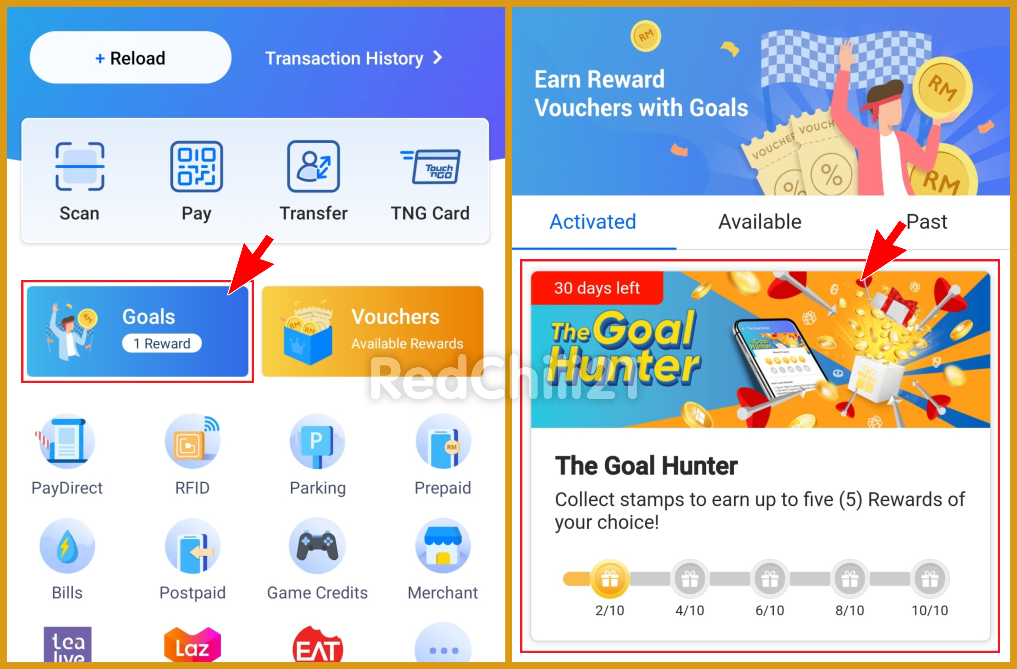※ 为了要收集这2个Stamps,你可在TNG App 还水费或其他账单!又或者消费方式,使用TNG 电子钱包付款也行哦!前提必须激活【The Goal Hunter】活动,才能获得Stamps!