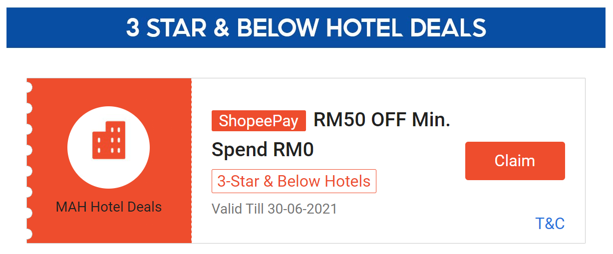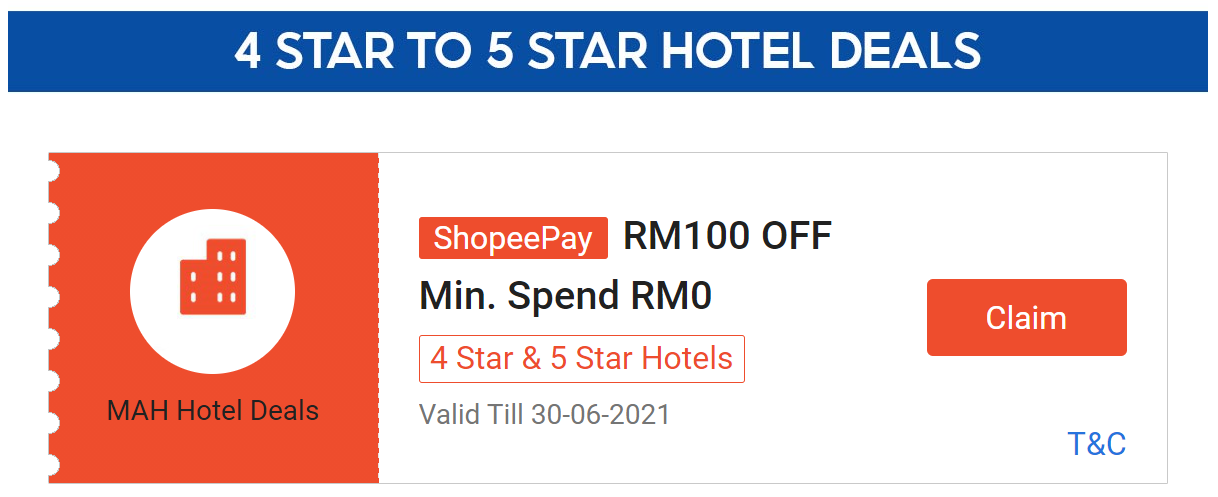 只要你在Shopee App 领取该RM100 折扣券,可用于预订国内旅游配套、四星和五星的酒店!以及3星酒店的RM50 折扣券!
