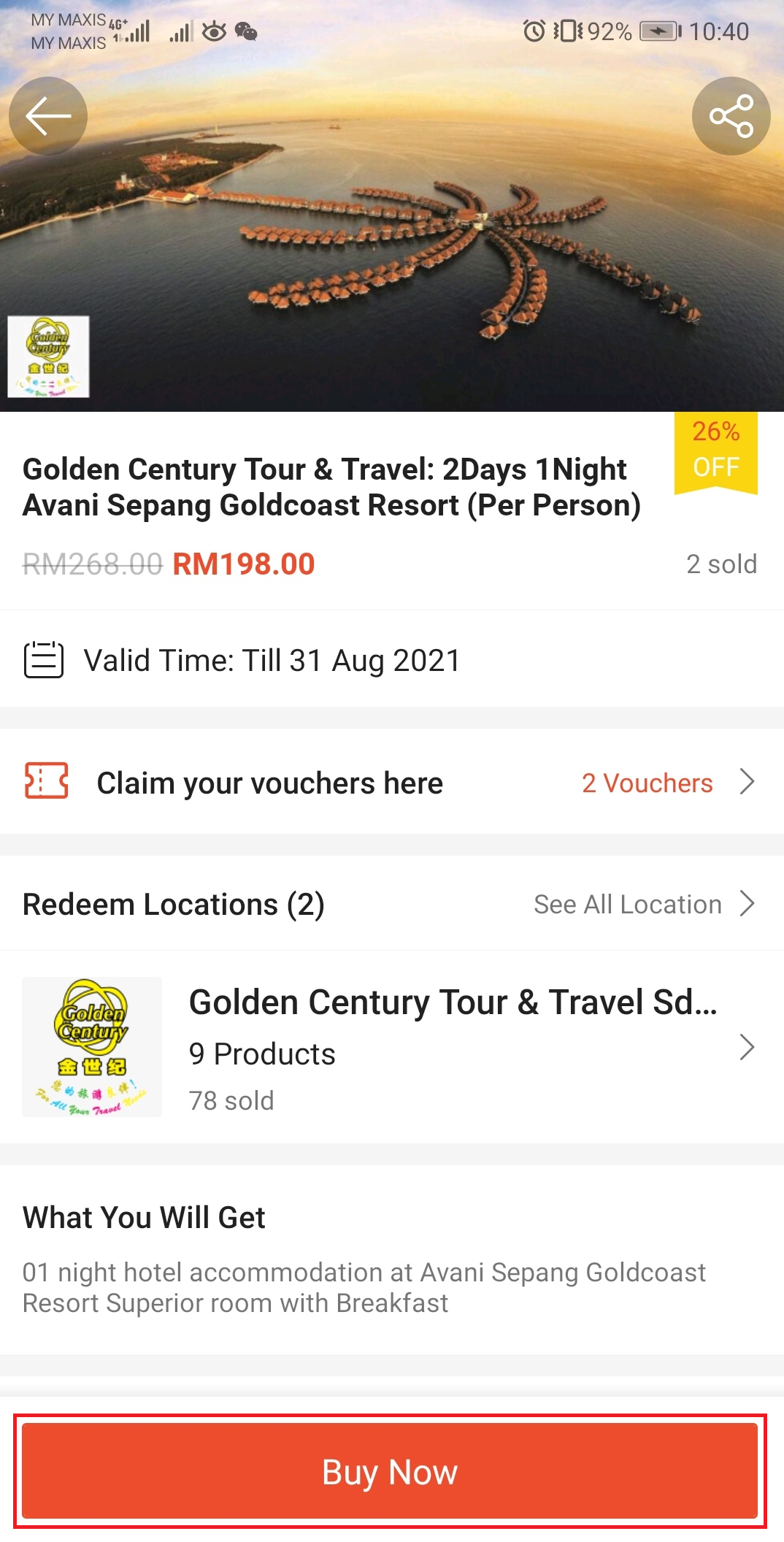 步骤2:找出2天1夜的Avani Sepang Goldcoast Resort (一个人配套;包含早餐)【点击这里】,点击「Buy Now」。