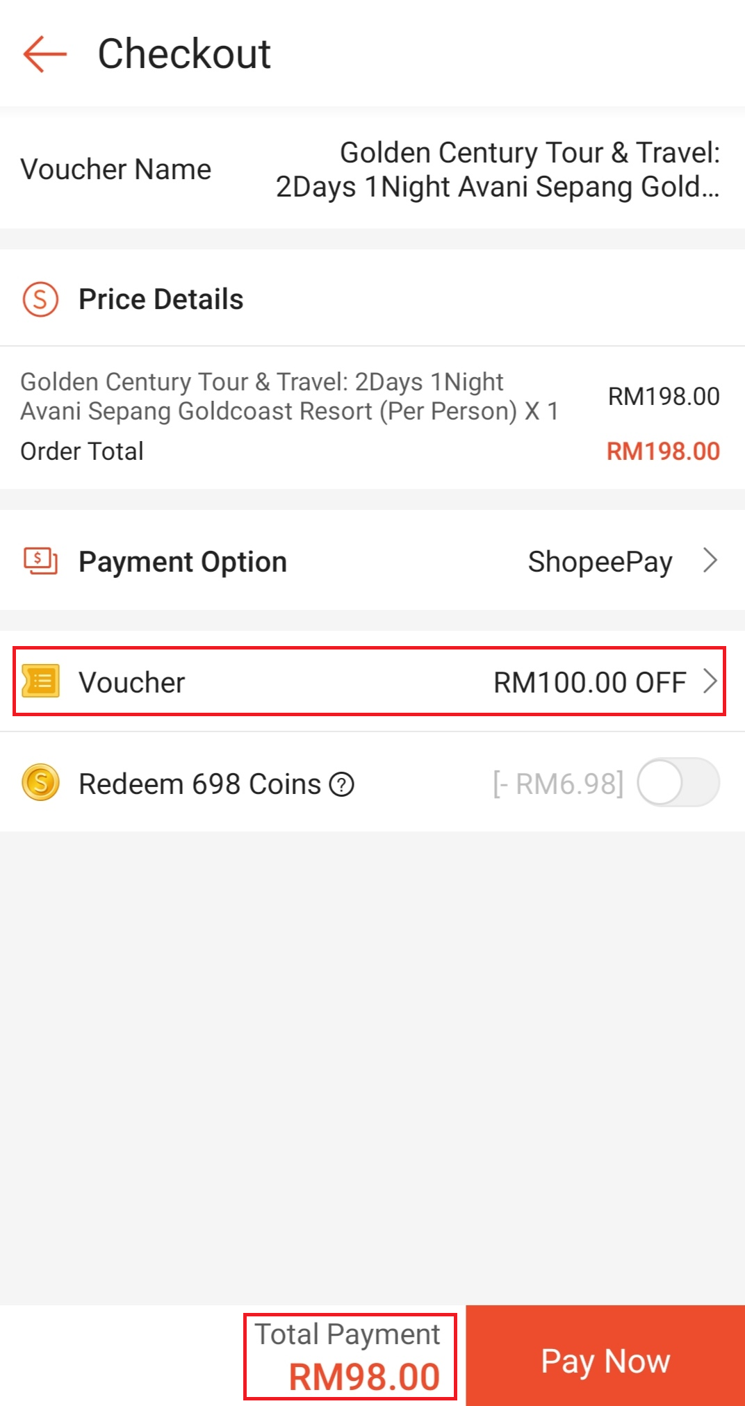 步骤4:此时系统显示出优惠价的RM198 Avani 水上屋配套折扣优惠券后,只需RM98。
