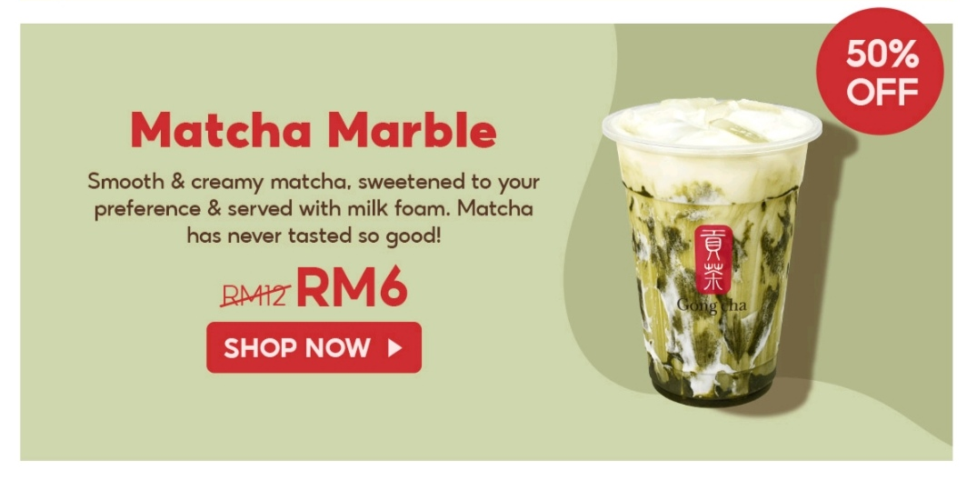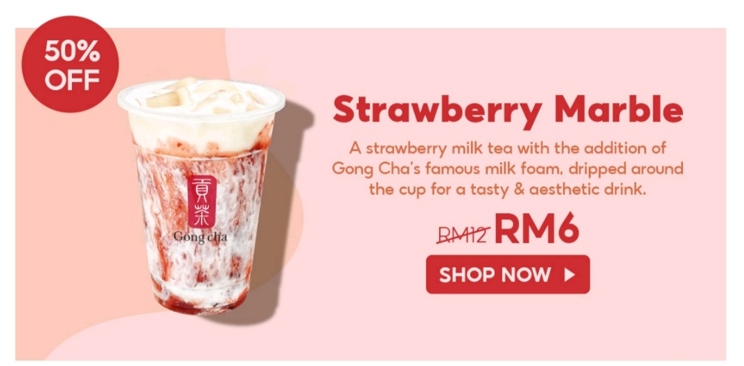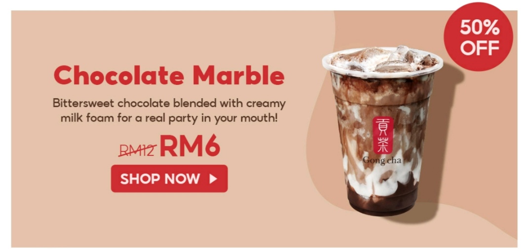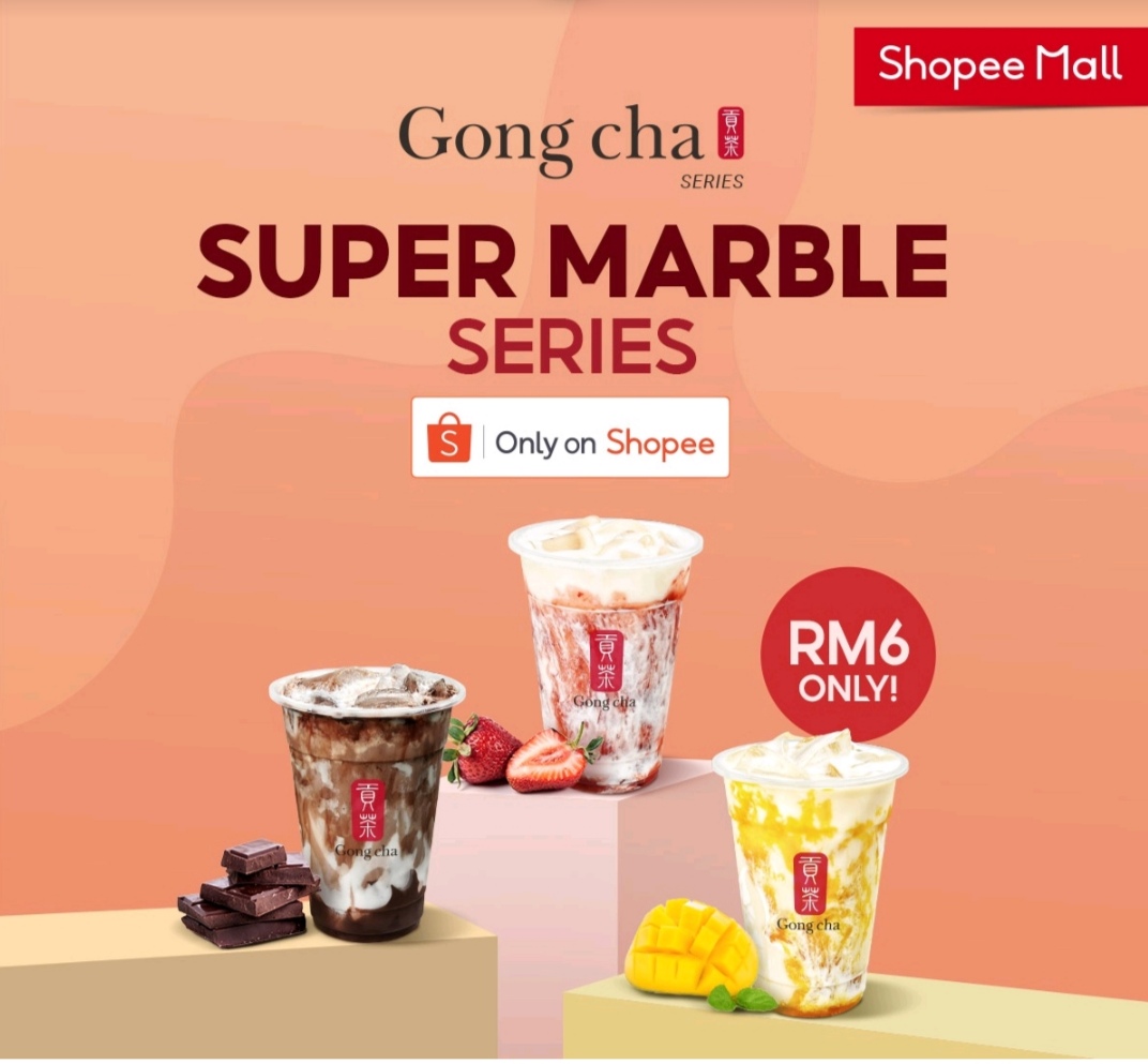 这项优惠是由Shopee 与Gong Cha 联合推出Super Marble 系列饮料可享有50%折扣!一杯饮料只需RM6,还是大杯装饮料哦!