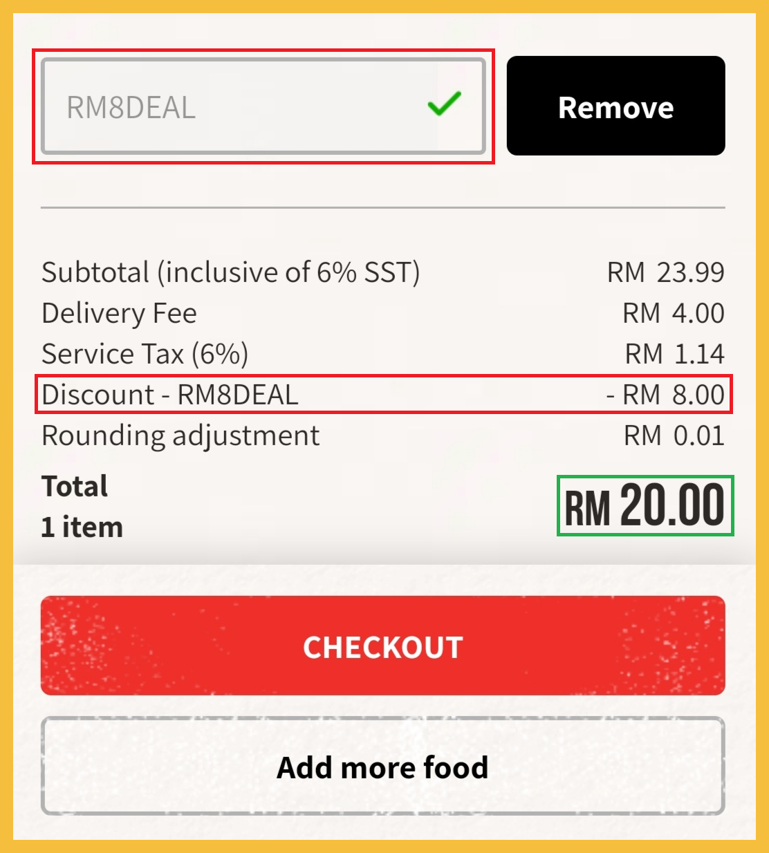 ※ 1份Original Recipe One Box Meal 原价RM23.99,折扣RM8【RM8DEALS】之后,只需RM20!这样看来~使用这个Promo Code 比较划算!