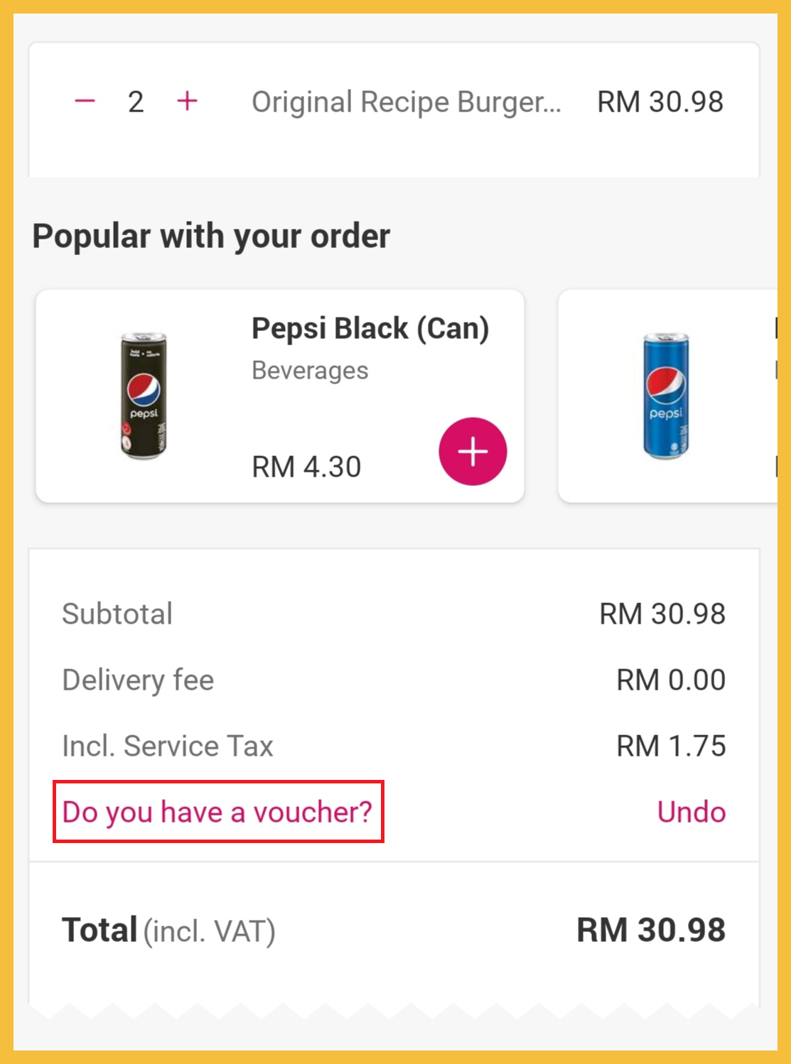 ※ 使用这个【ORIGINAL】优惠码,购买Original Recipe One Box Meal(炸鸡汉堡套餐)需缴付RM25.60(价钱包含服务税和外送RM4 费用)!