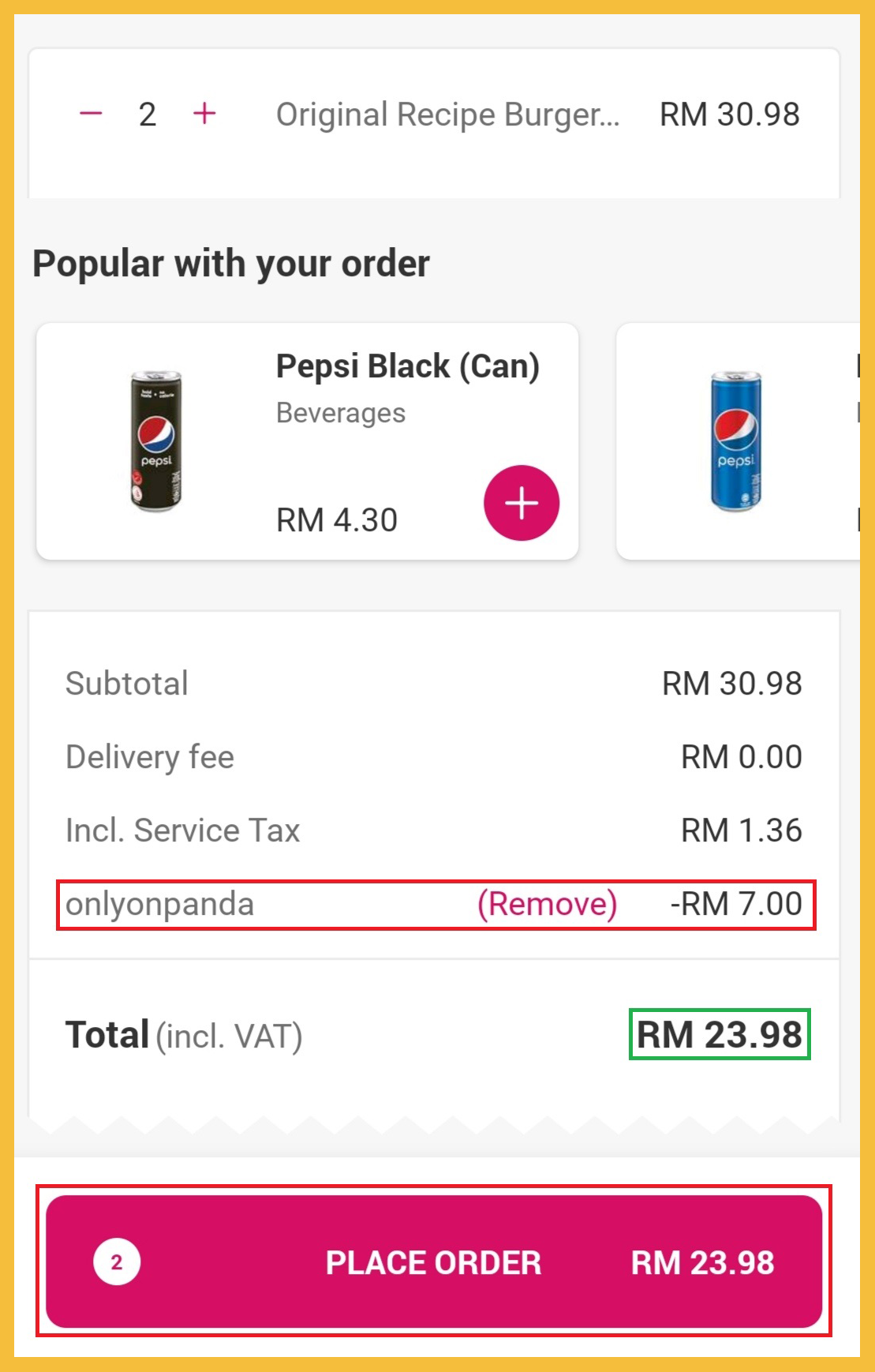 ※ 为了要达到消费RM30,折扣RM7!所以小编购买2份Original Recipe Burger Combo 原价RM30.98,折扣【ONLYONPANDA】RM7之后,只需RM23.98!平均一份只需RM11.99!