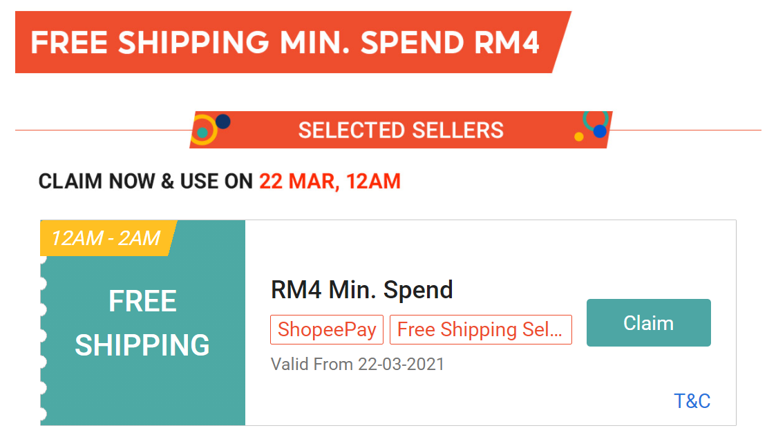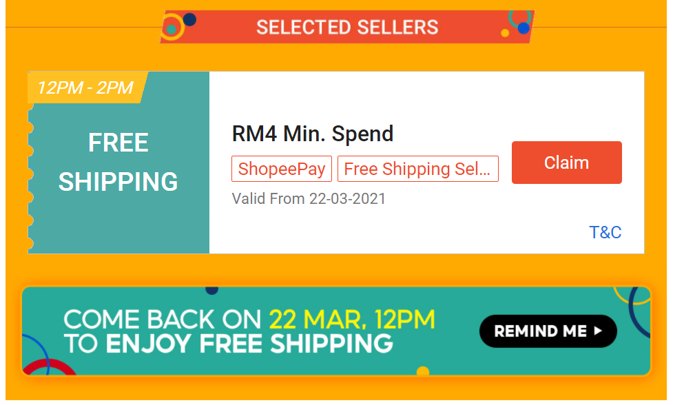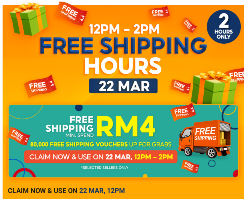 3月22日当天的12am、12pm和8pm 这3个时段,在指定商家最低消费RM4可获得免邮券!必须使用ShopeePay 付款!记得要去Claim 这些免邮Voucher 哦!