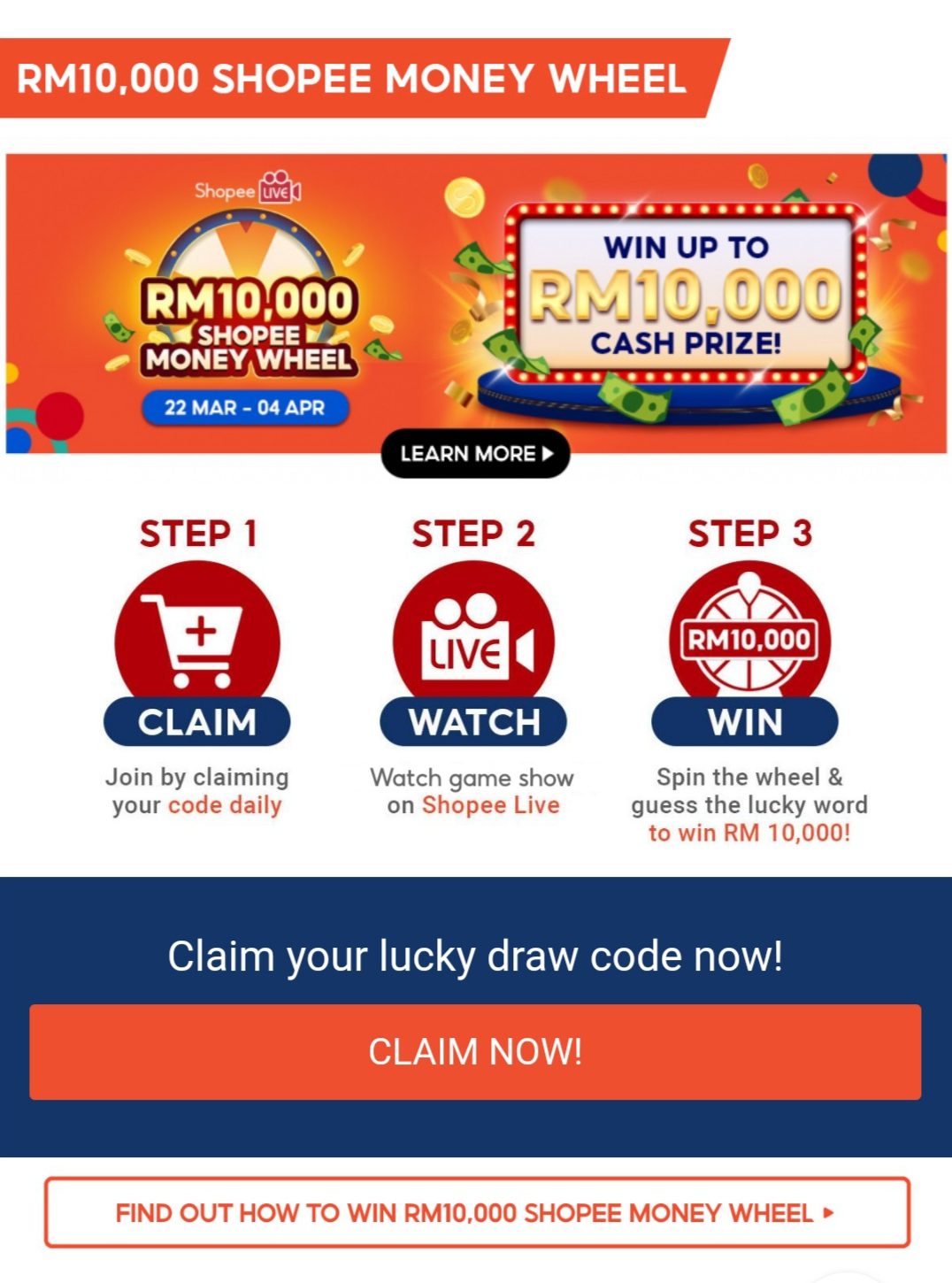 收看Shopee Live 游戏直播,将有机会赢取高达RM10,000 奖金!别忘了点击Shopee 抽奖代码!