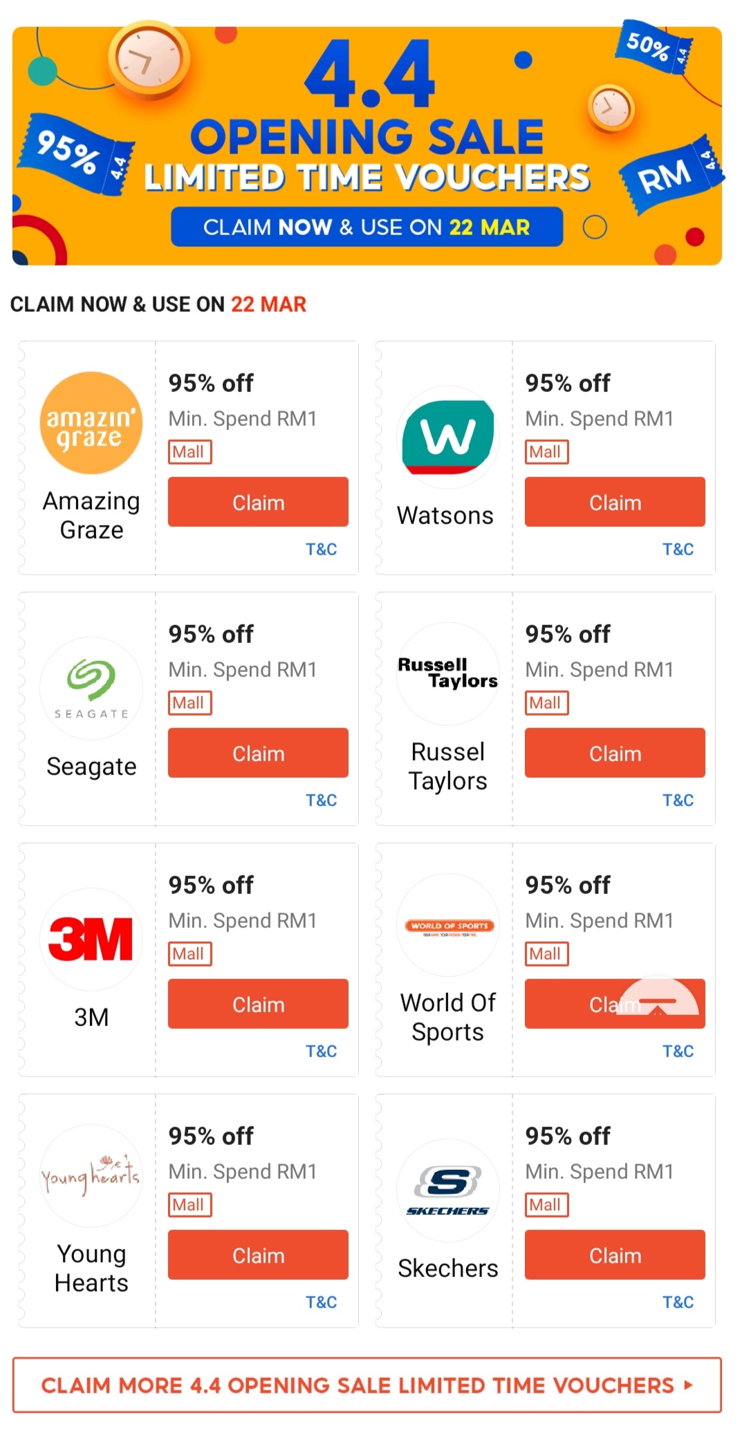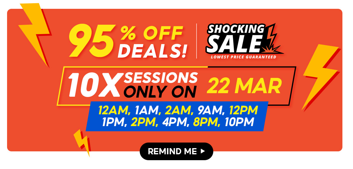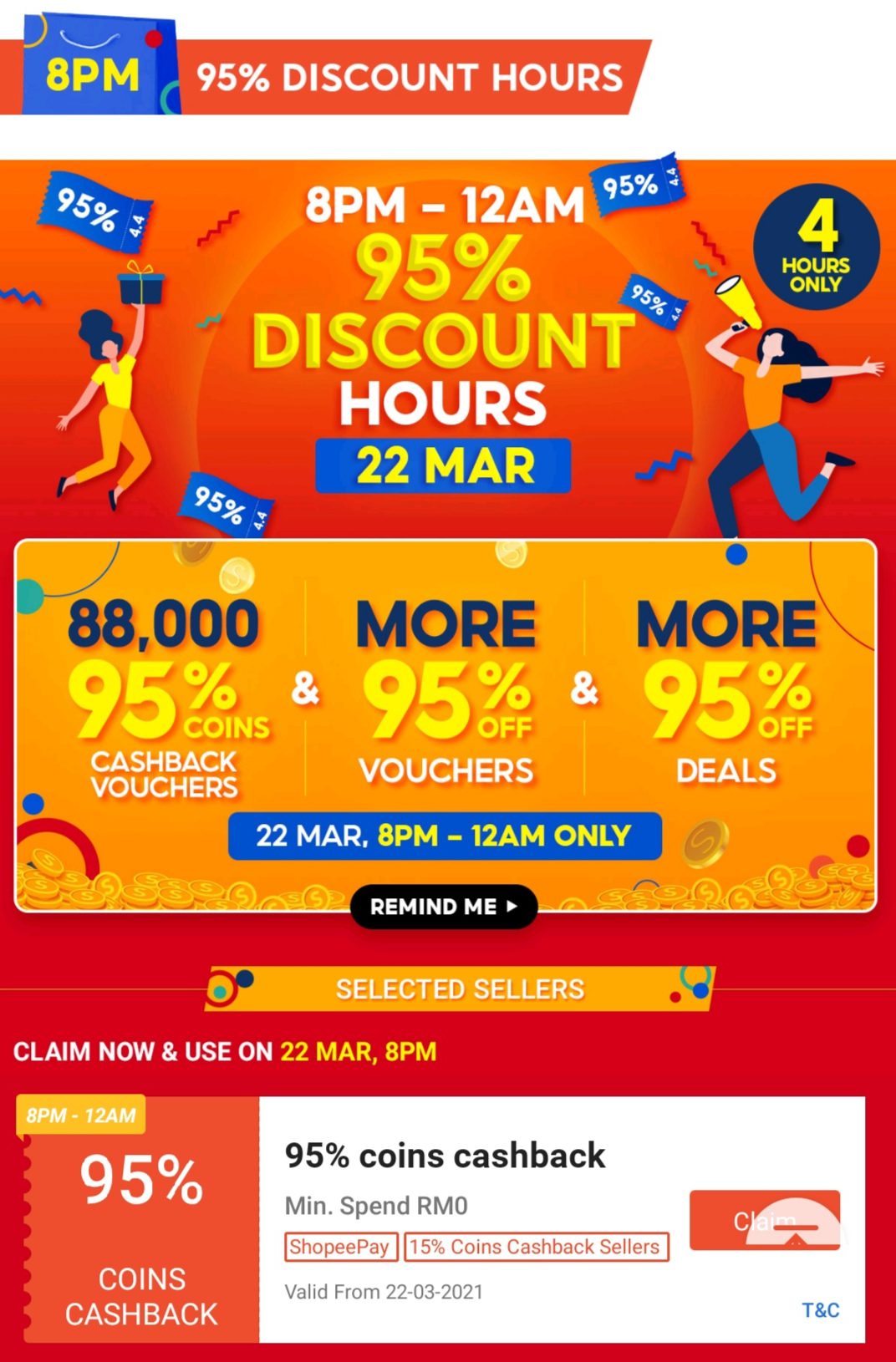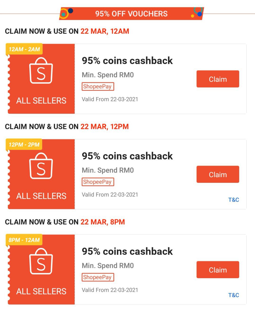 在3月22日当天的12am、12pm和8pm 这3个时段可使用95%折扣优惠券!无限制最低消费,但必须使用ShopeePay 付款!