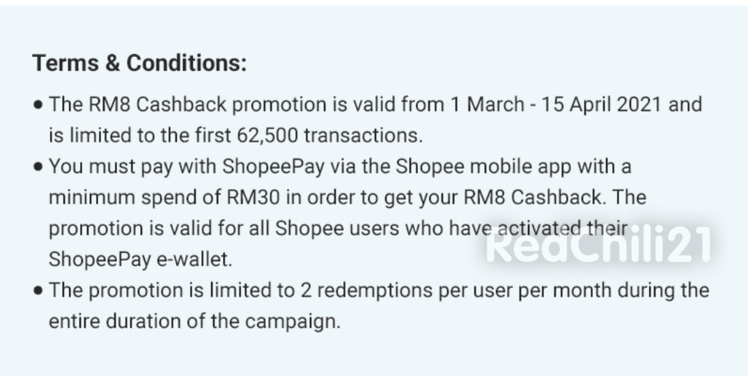- 每月每位用户只限兑换2次该优惠(总可获得4次,可获高达RM32 回扣)