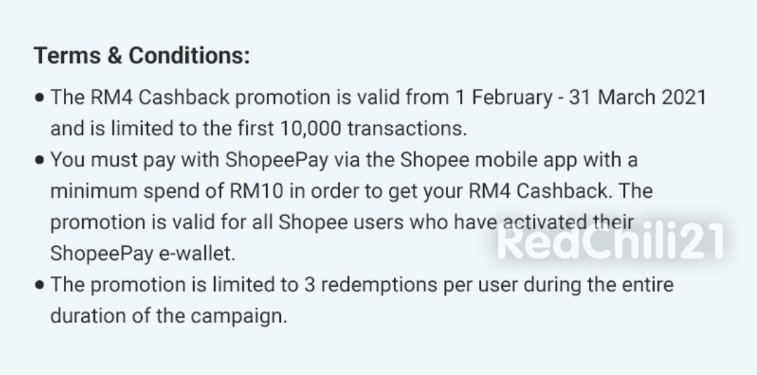 促销活动: 使用Shopee Pay 付款并消费RM10,可获得RM4现金回扣