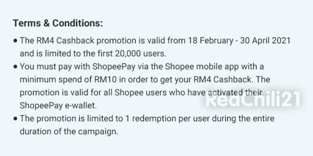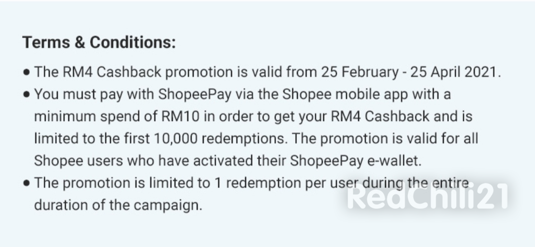 促销活动: 使用Shopee Pay 付款并消费RM10,可获得RM4现金回扣