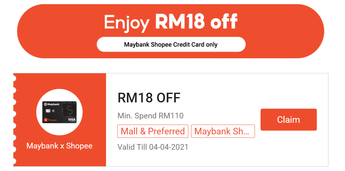 ① Maybank Shopee Visa Platinum Card – 消费RM110,可折扣RM18【点击这里】