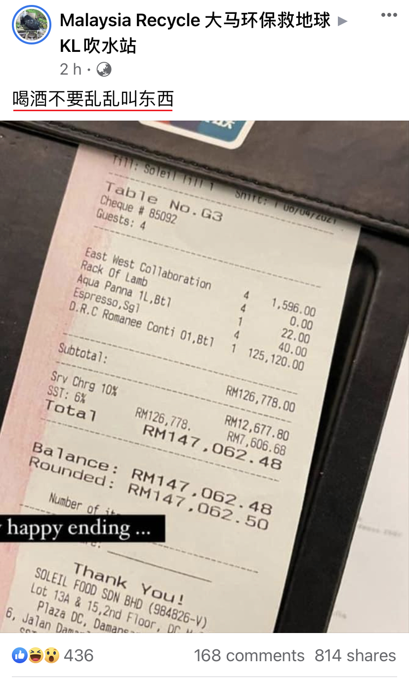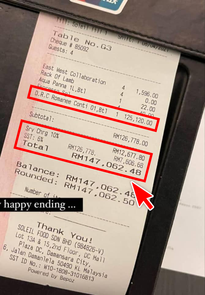 除了奢华的主食,这桌人还点了一瓶酒,价值RM125,200!加上10%的服务税RM12,677,6%的SST RM7,606.68,这一桌人当晚的总消费是RM147,062.48!