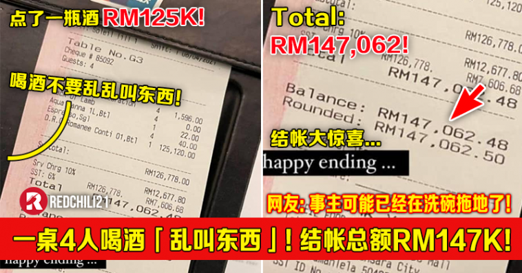 随便order东西喝,结果结帐的时候才发现是价值6位数的一瓶酒,加上5位数的服务税,总共RM14万!