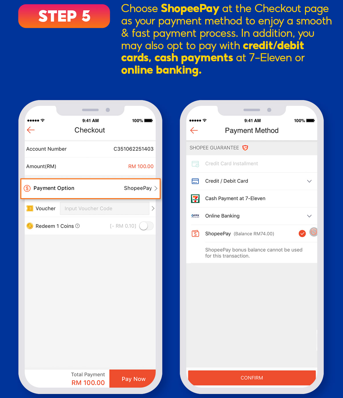 步骤5:在付款页面中,可选择ShopeePay 付款或使用Credit/Debit 、7-Eleven 现金支付或Online Banking 付款也行哦!
