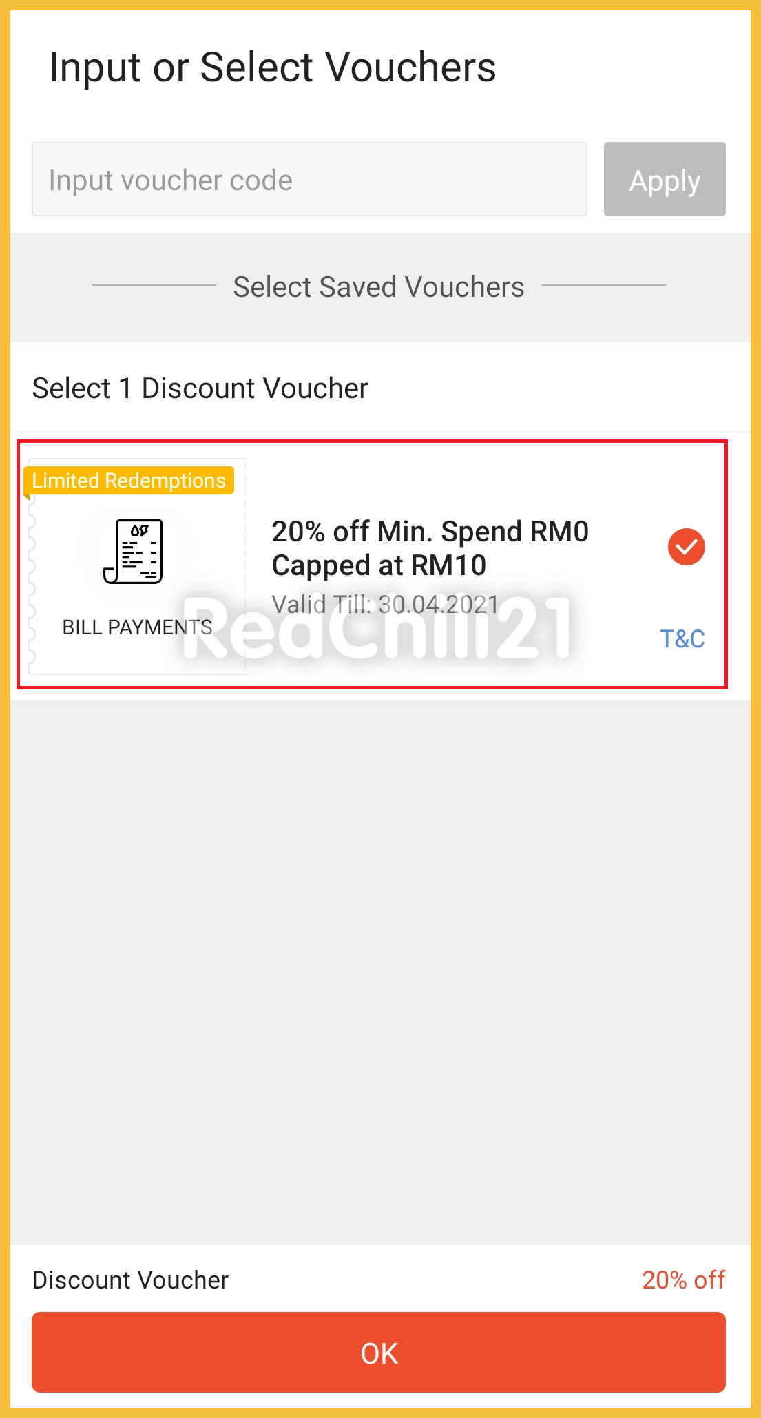 步骤6:点击「Input Voucher Code」,选择Bill Payment 折扣20%优惠券,点击「OK」!