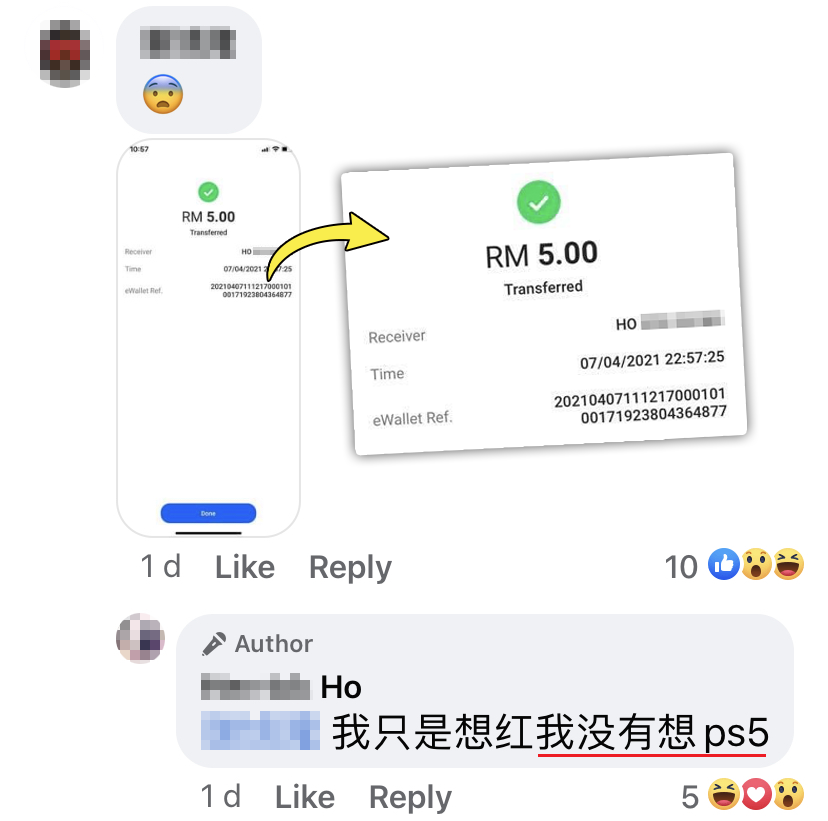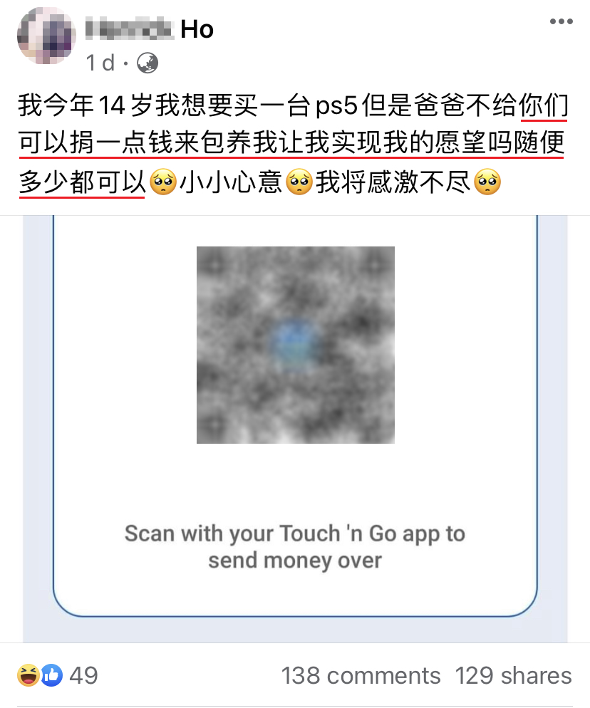 声称年仅14岁的他在脸书PO文,称自己很想买一台PS5,但由于父亲不让买所以请网友们捐一点钱帮他实现愿望,他在帖文附上自己的TNG eWallet 二维码方便网友们扫码送红包。