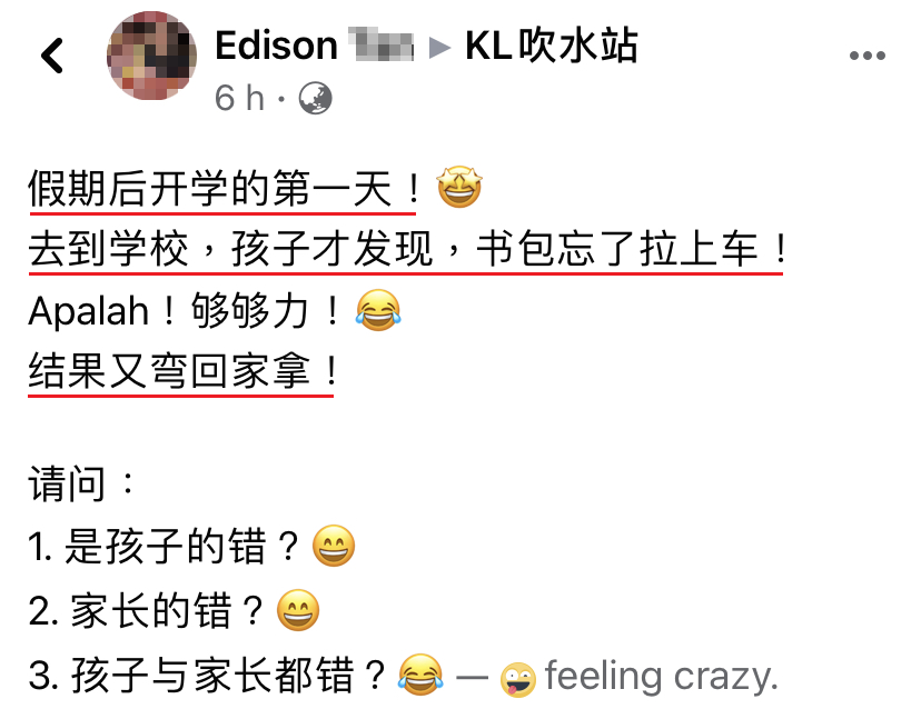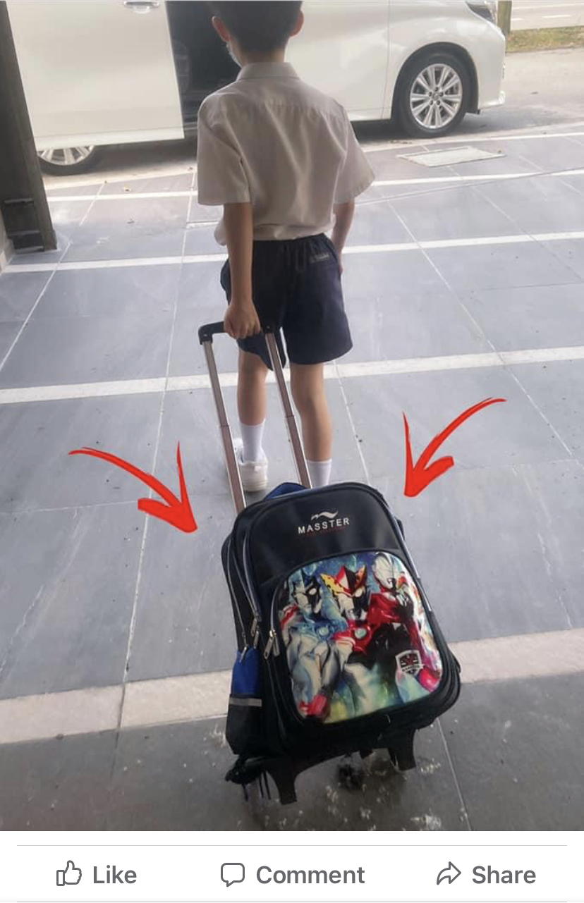 今天早上一名大马爸爸在脸书PO文,开学的第一天送孩子去上学,结果到了学校,孩子才发现他的MASSTER 书包根本没有带上车!没有书还上什么课?因此爸爸无奈只好再跑一趟路,载孩子回家拿书包。