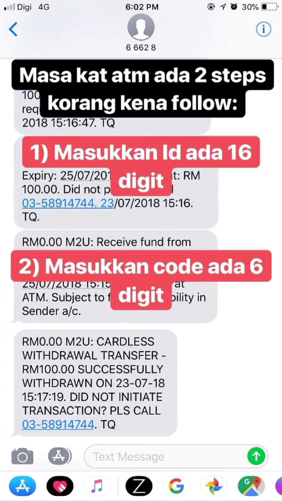 ▼ Step 7:接下来你的手机就会收到2条短信,输入16个数位ID和6个数位号码即可提款!