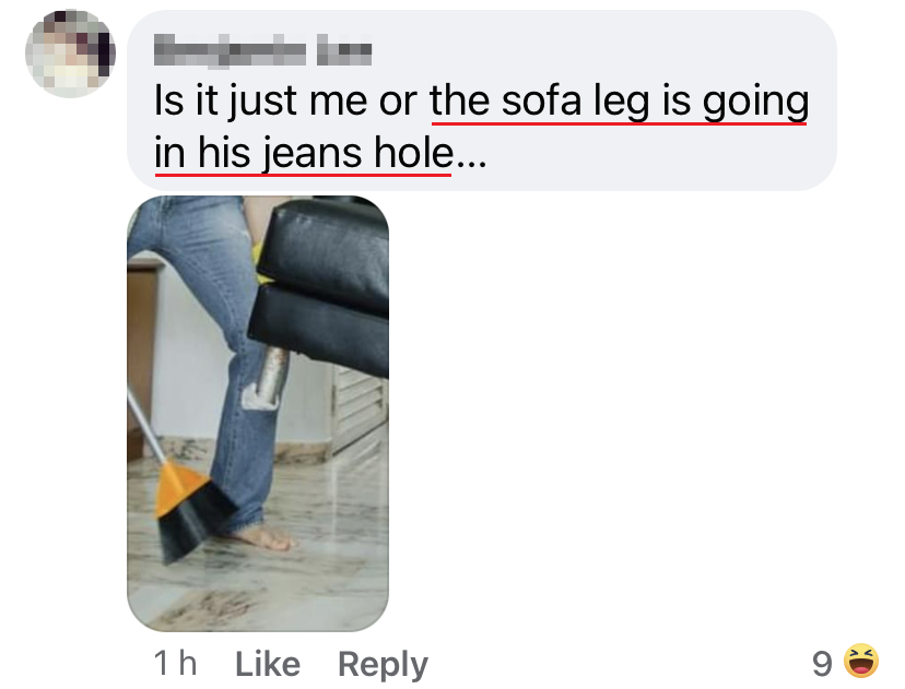 ▼ 眼尖的网友发现:沙发的脚居然插在猛男的裤子!