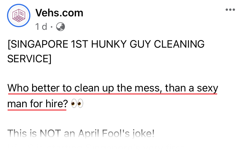 VEHS 正式推出全新加坡第一个肌肉猛男的清洁服务,仅限于这要来的周末!现在赶快联系我们订购这限时的清洁服务!