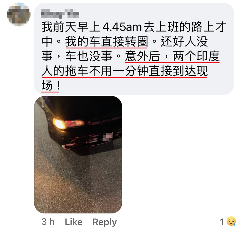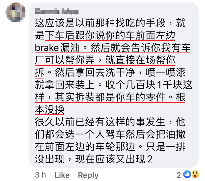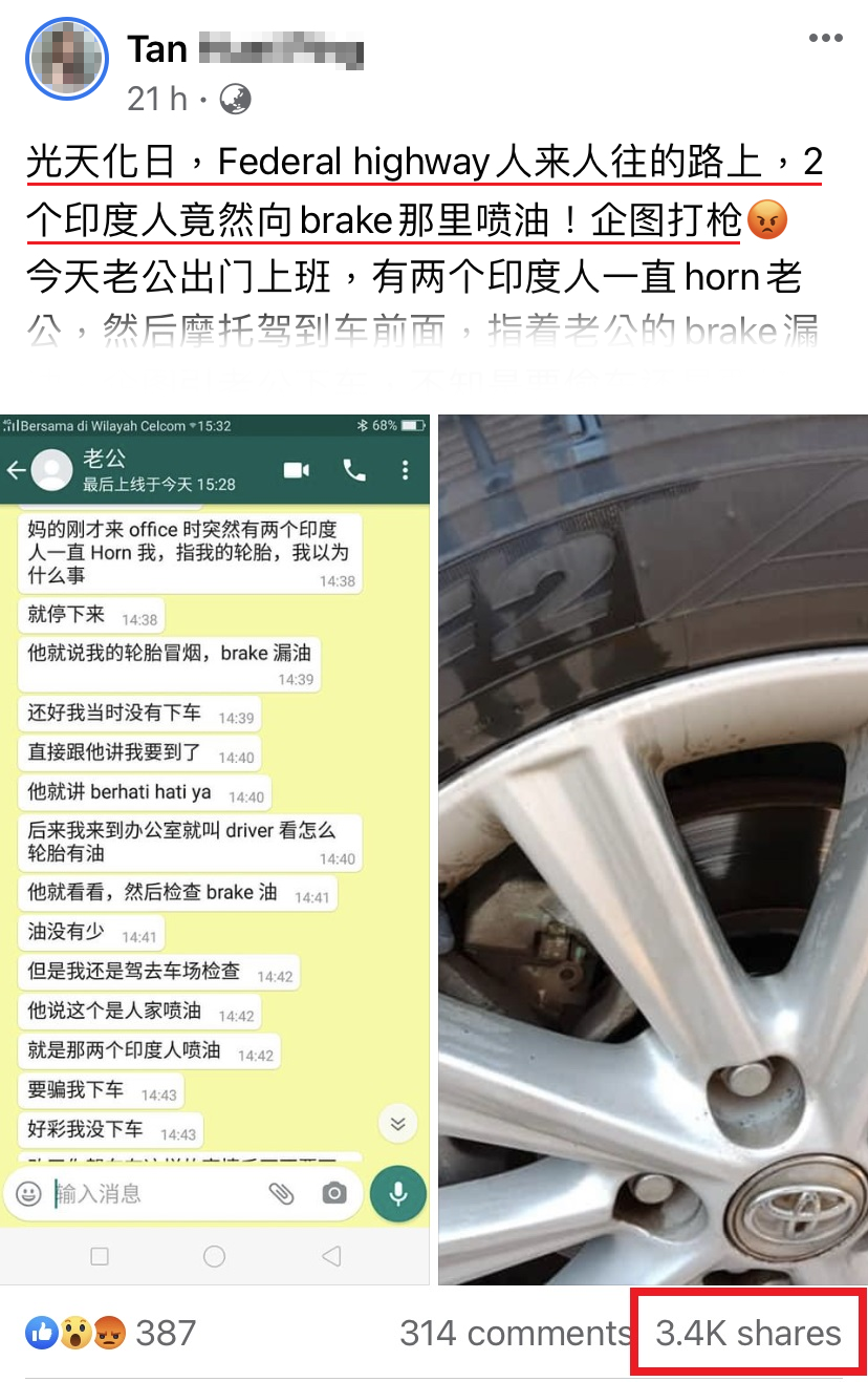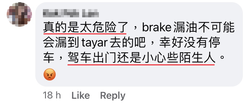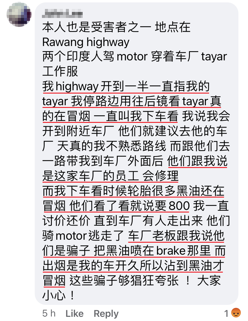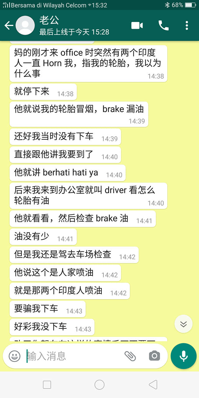 今天老公出门上班,有两个印度人一直 horn 老公,然后摩哆驾到车前面,指着老公的 brake 漏油,企图引老公下车,不知是要偷车还是要打抢。后来老公觉得不对劲,马上开车走人,两位印度人还说:「berhati-hati!」