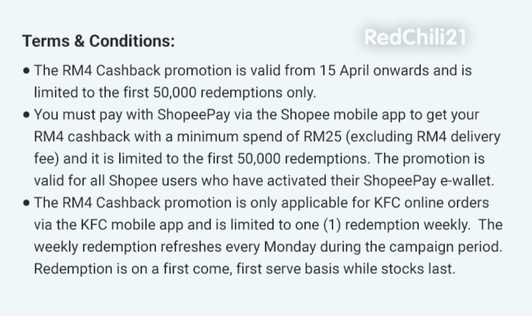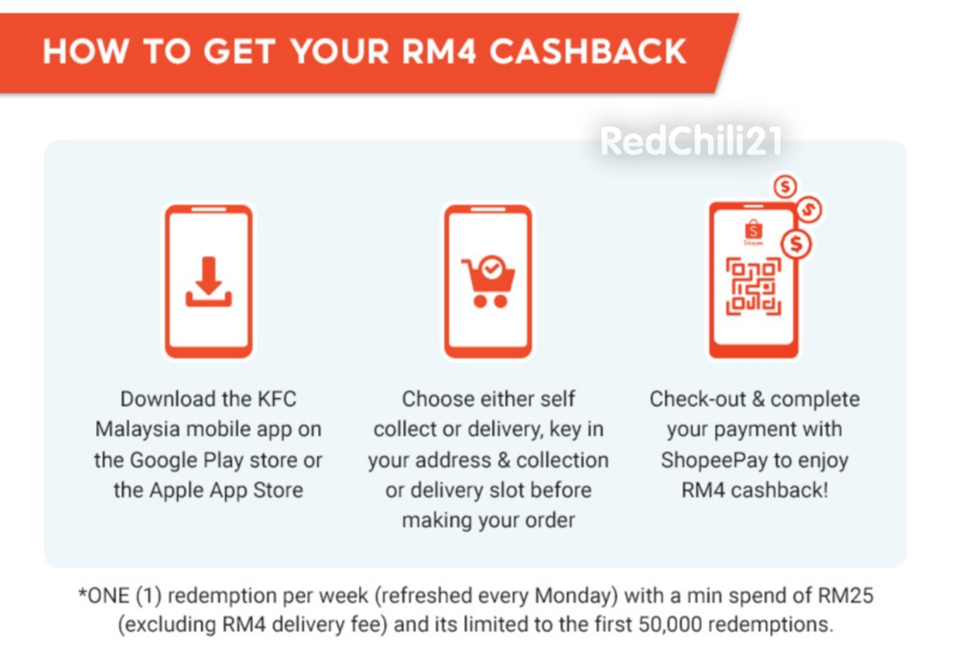 这项优惠是由大马KFC 与ShopeePay 联合推出优惠活动!只要消费RM25 或以上,就可获得RM4 现金回扣!但必须使用于ShopeePay 付款!