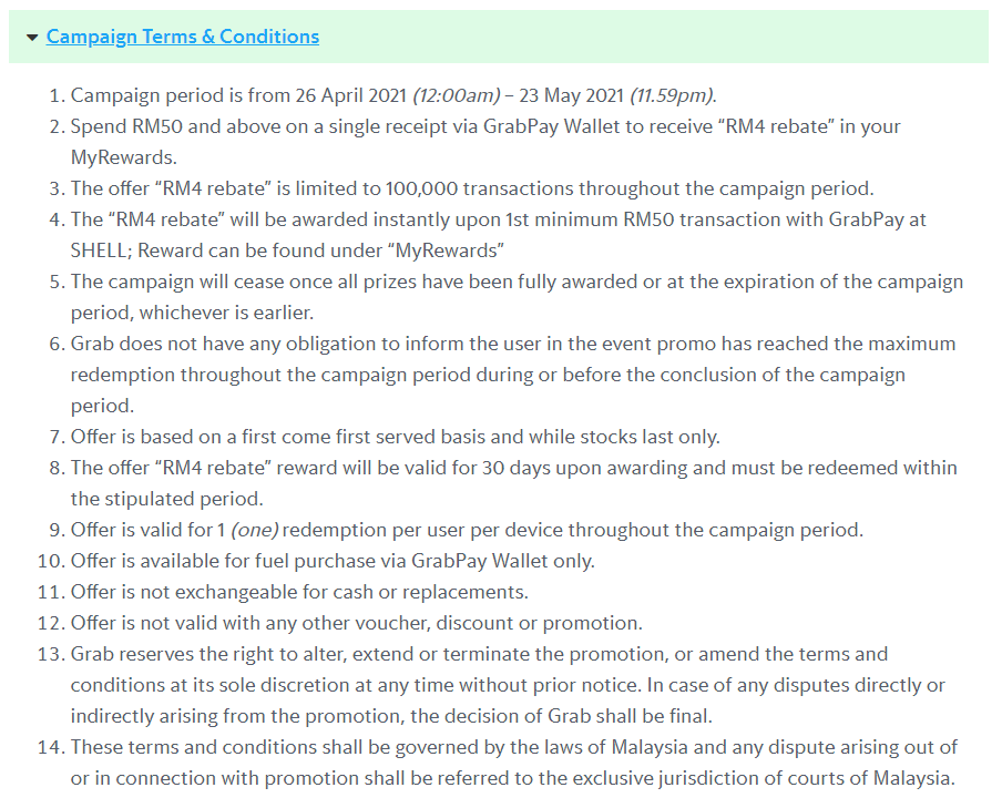 - 在Shell 与GrabPay 进行第一笔最低RM50 交易时,才可获得RM4 回扣