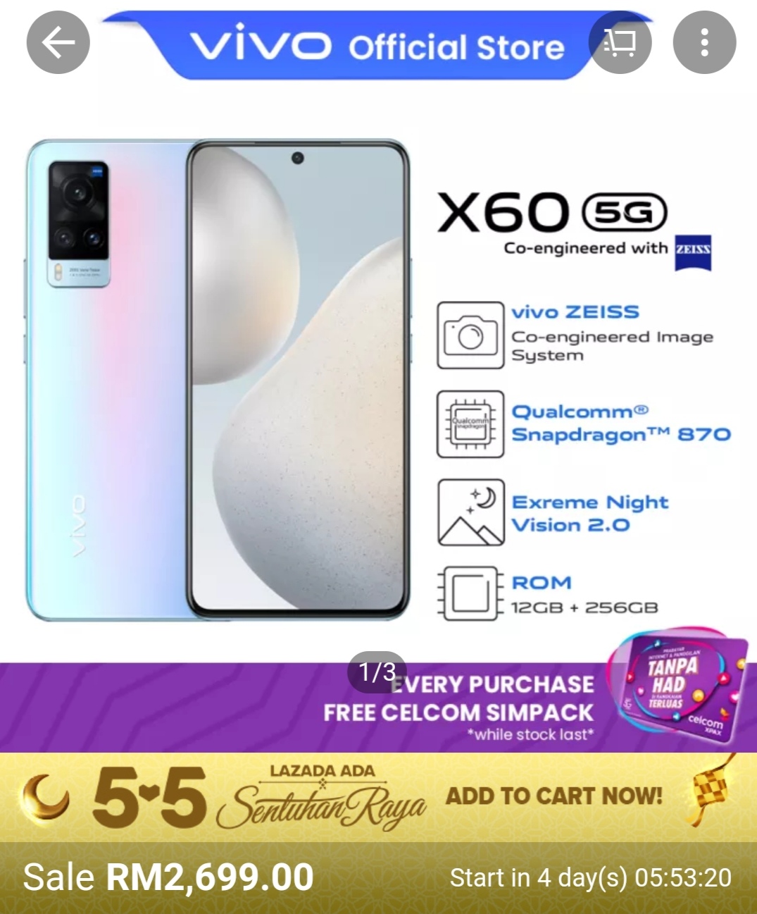 ▪ vivo X60 5G Smartphone (12GB + 256GB)- RM9999 RM2699【点击这里】