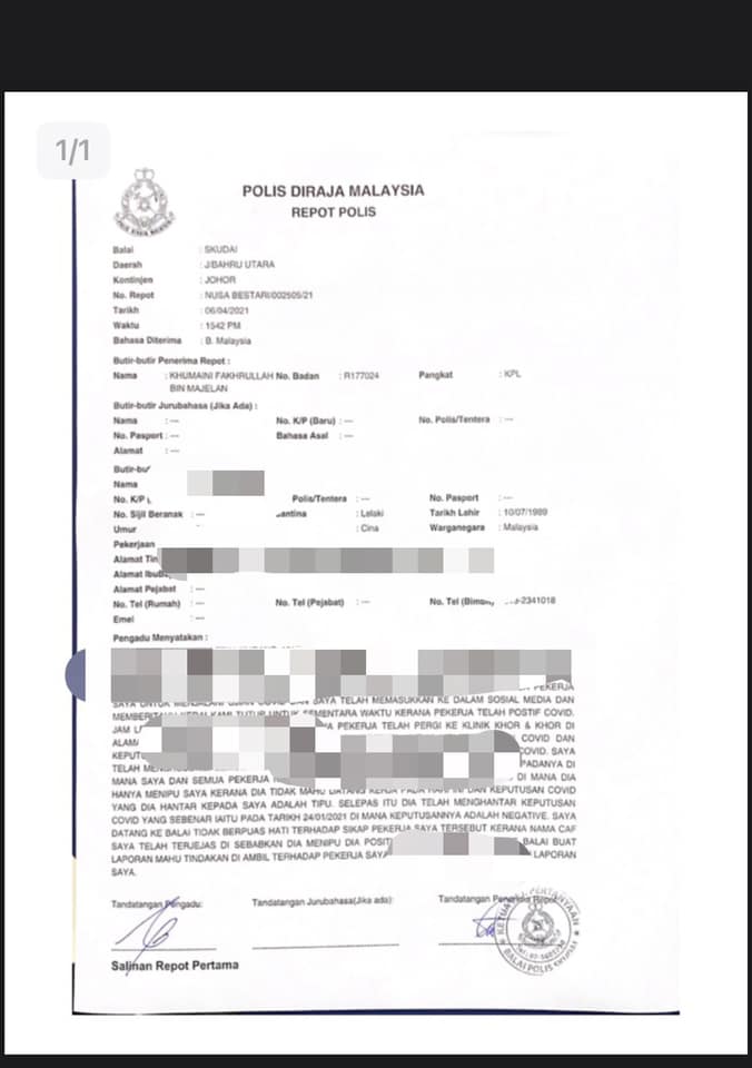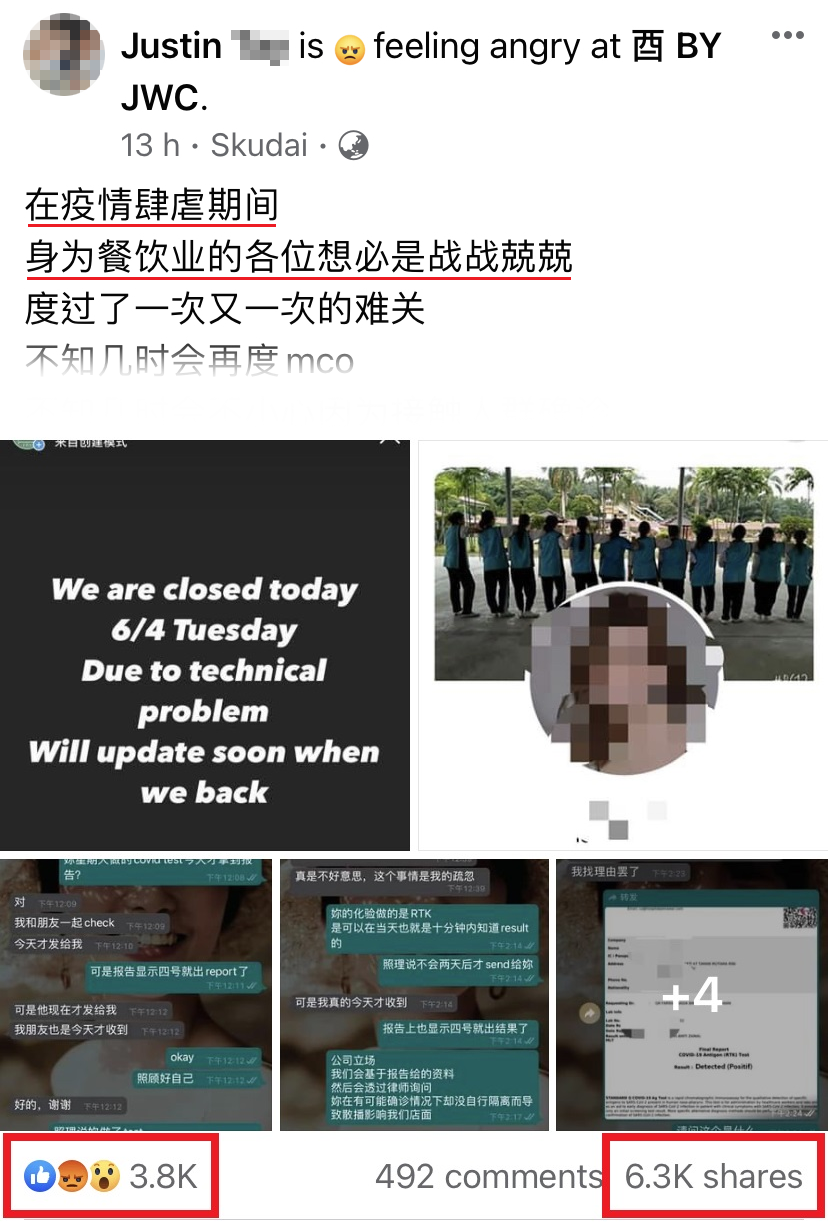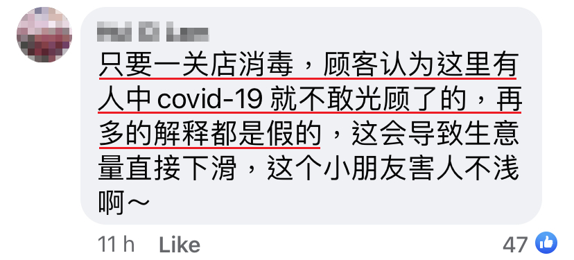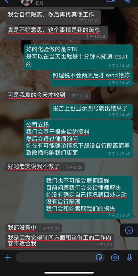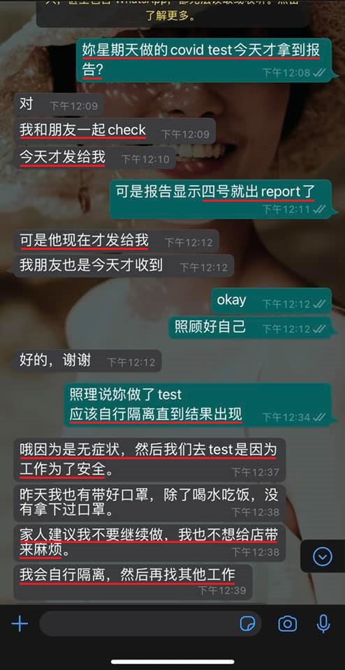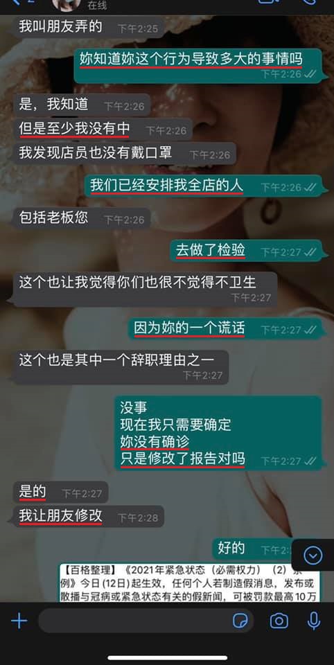 今天却发生了一件绝不能容忍、愤怒至极的事情,就在今天早上10.30分左右,我们收到一个刚上班一天的员工证实确诊。我们管理层就戒备了起来,也马上安排所有上班员工做Covid测试,所幸所有人都是negative。也立即关闭门店安排消毒,甚至通知了昨天光顾的顾客。