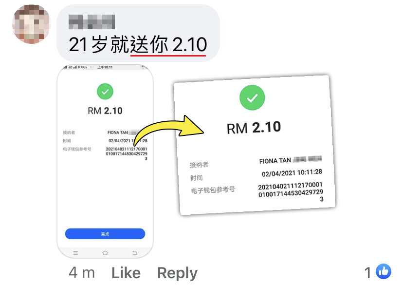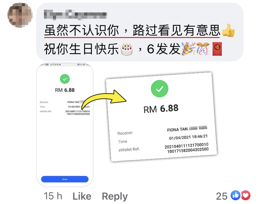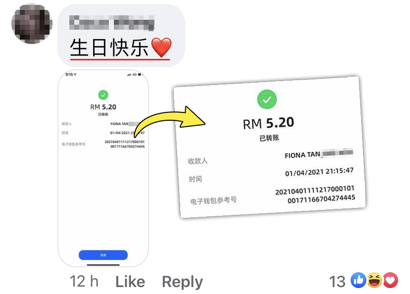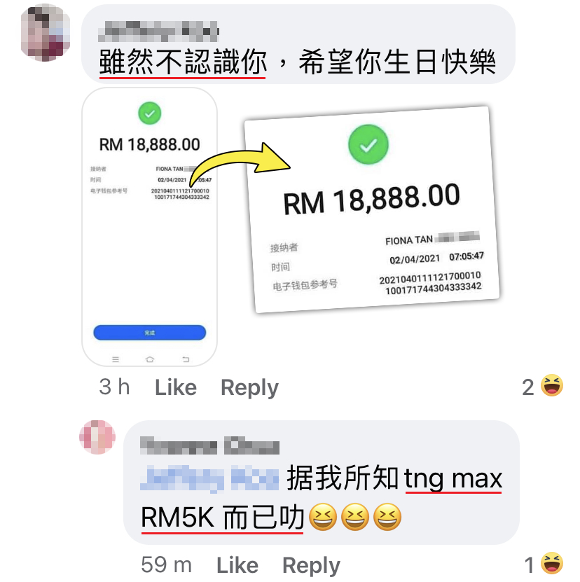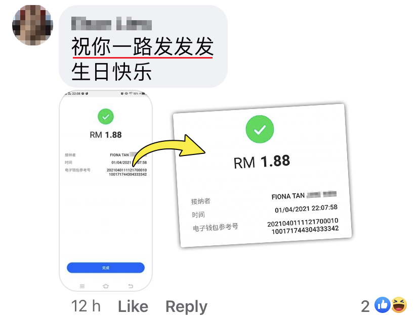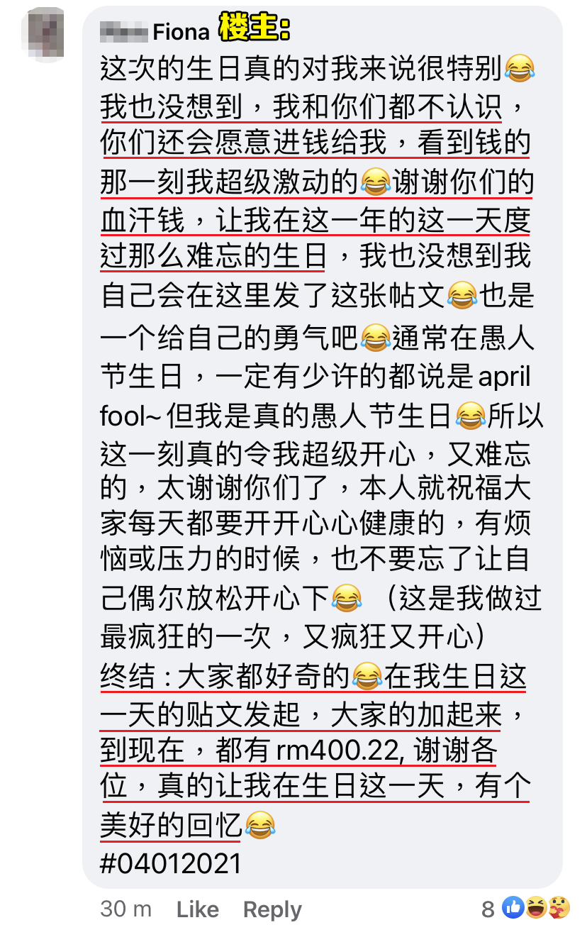 ▼ 寿星果然遵守诺言,今天就在评论区公布了总金额:RM400.22入账!