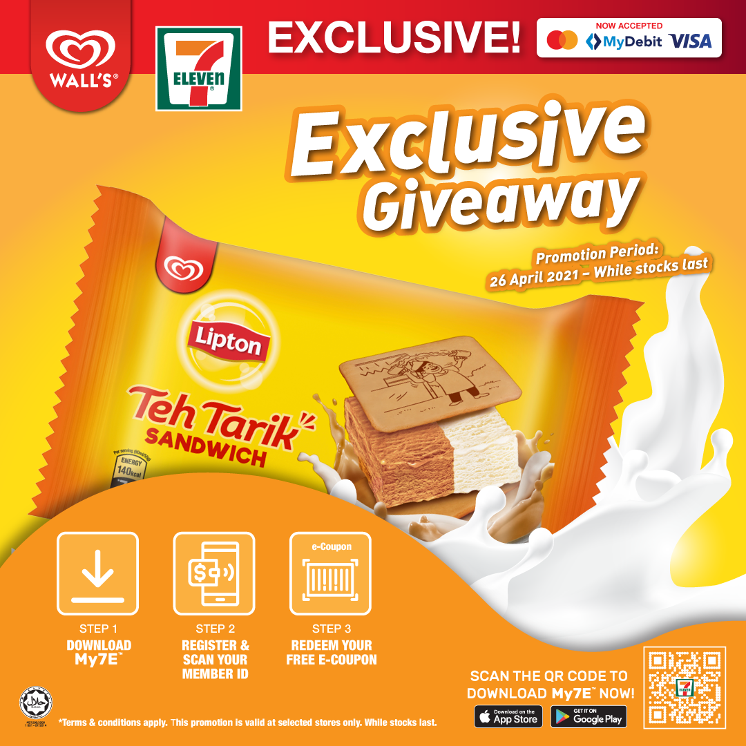 只要你到指定大马7-Eleven 分行进行扫描会员ID 及兑换免费雪糕的优惠券(e-Coupon)就可免费领取Wall’s Lipton Teh Tarik Sandwich 三明治雪糕!