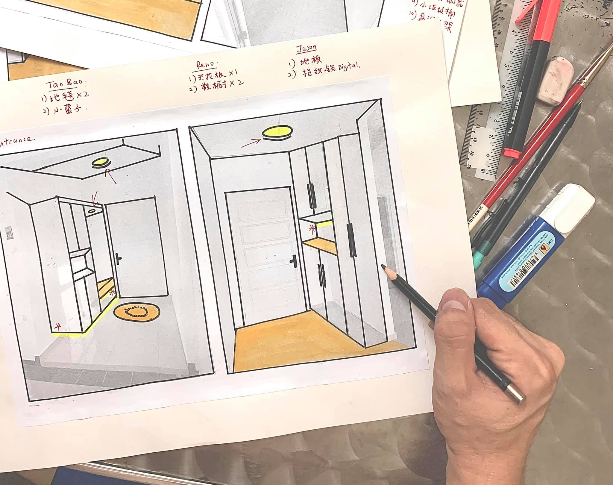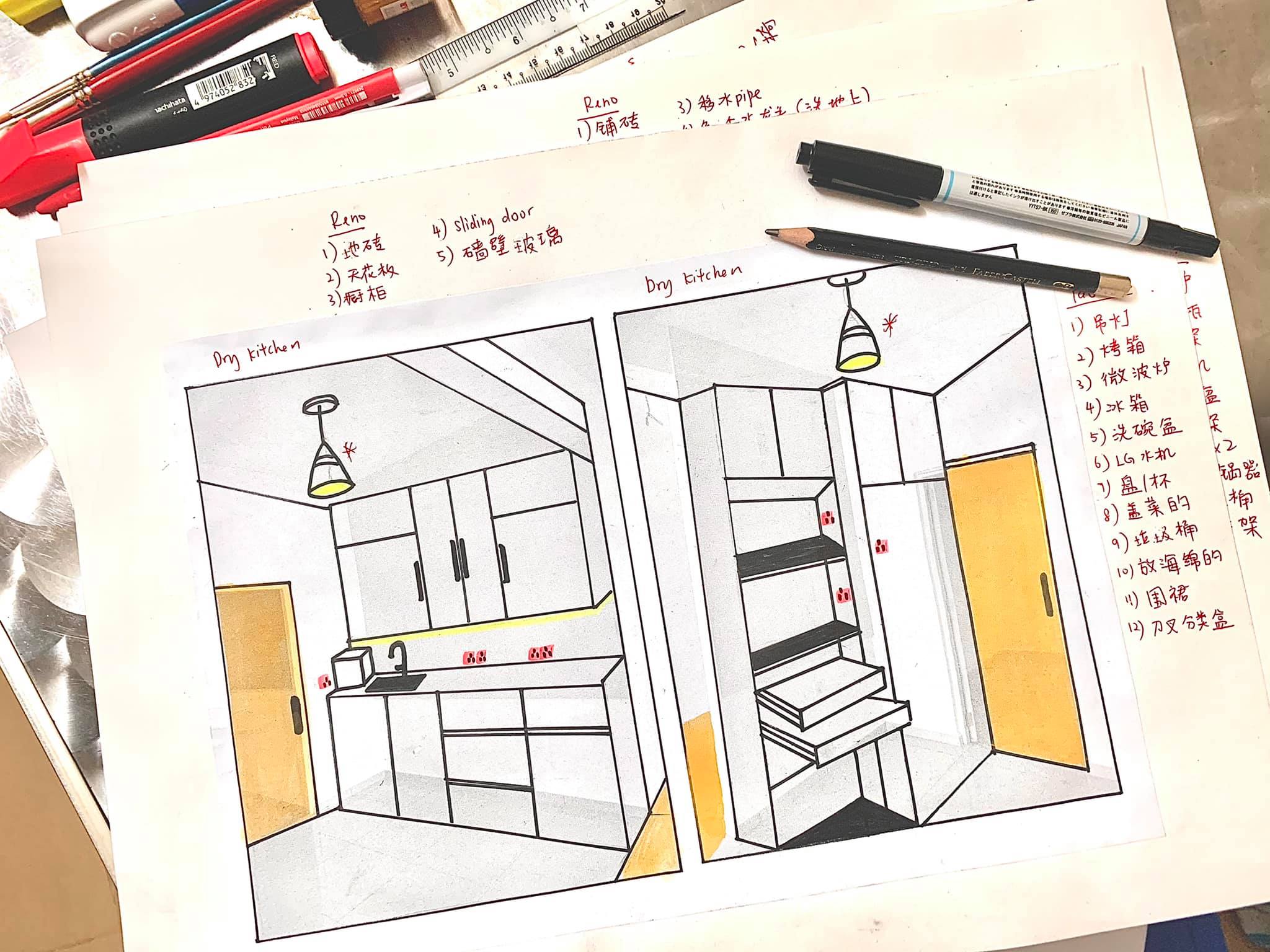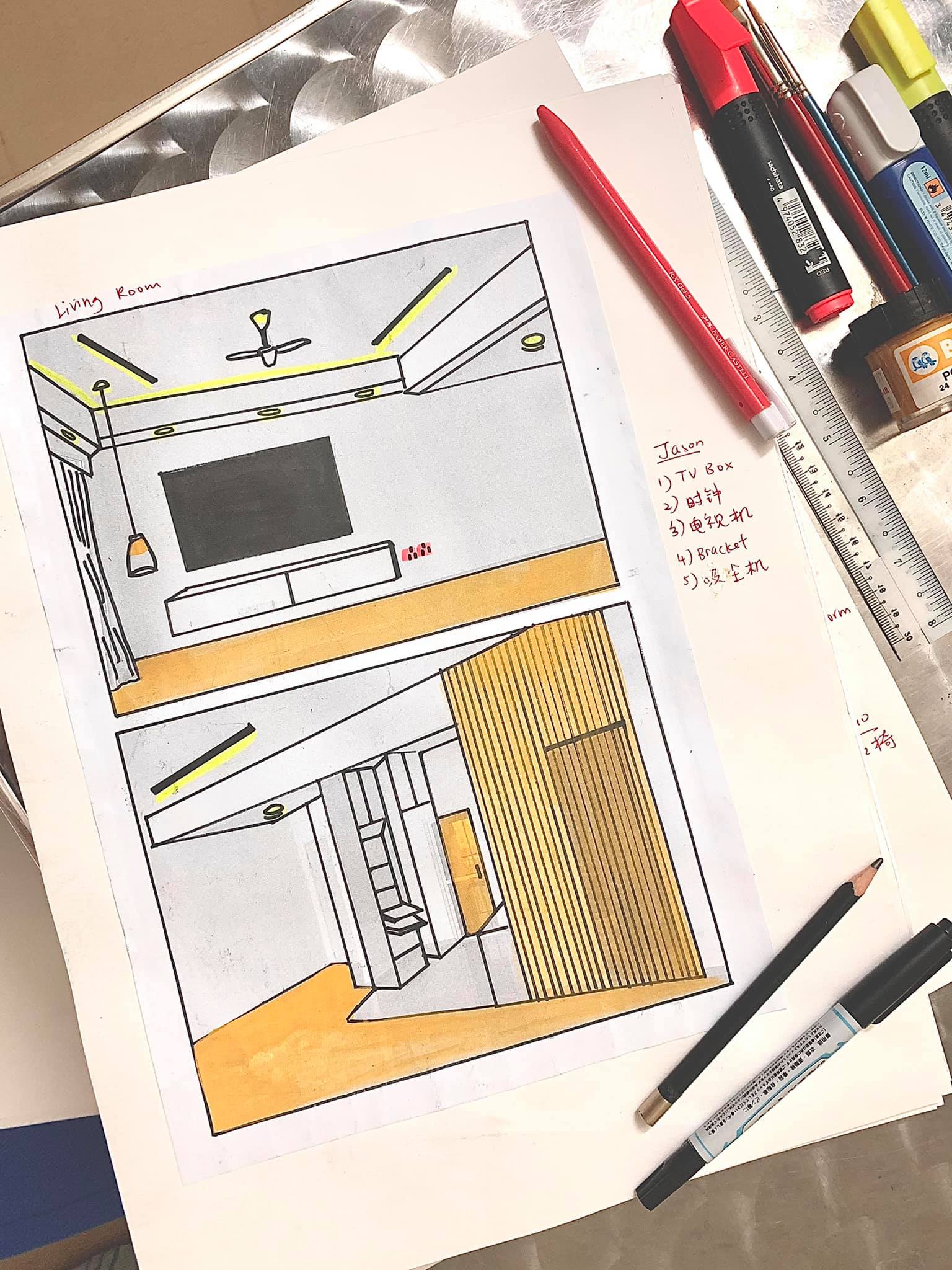 自己用图画纸大概画出像 3D 又不像 3D 的图,自己也是要做功课在 Pinterest app 找 idea,我都是在那边看我要的设计,画出来直接给做家私的人看。