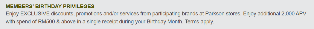 促销条件:在生日月份内消费 RM500或以上(单张收据),可额外获得2000APV