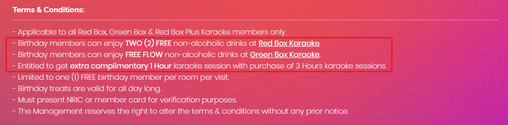 - 会员寿星可获得2杯无酒精饮料(限于Red Box Karaoke)