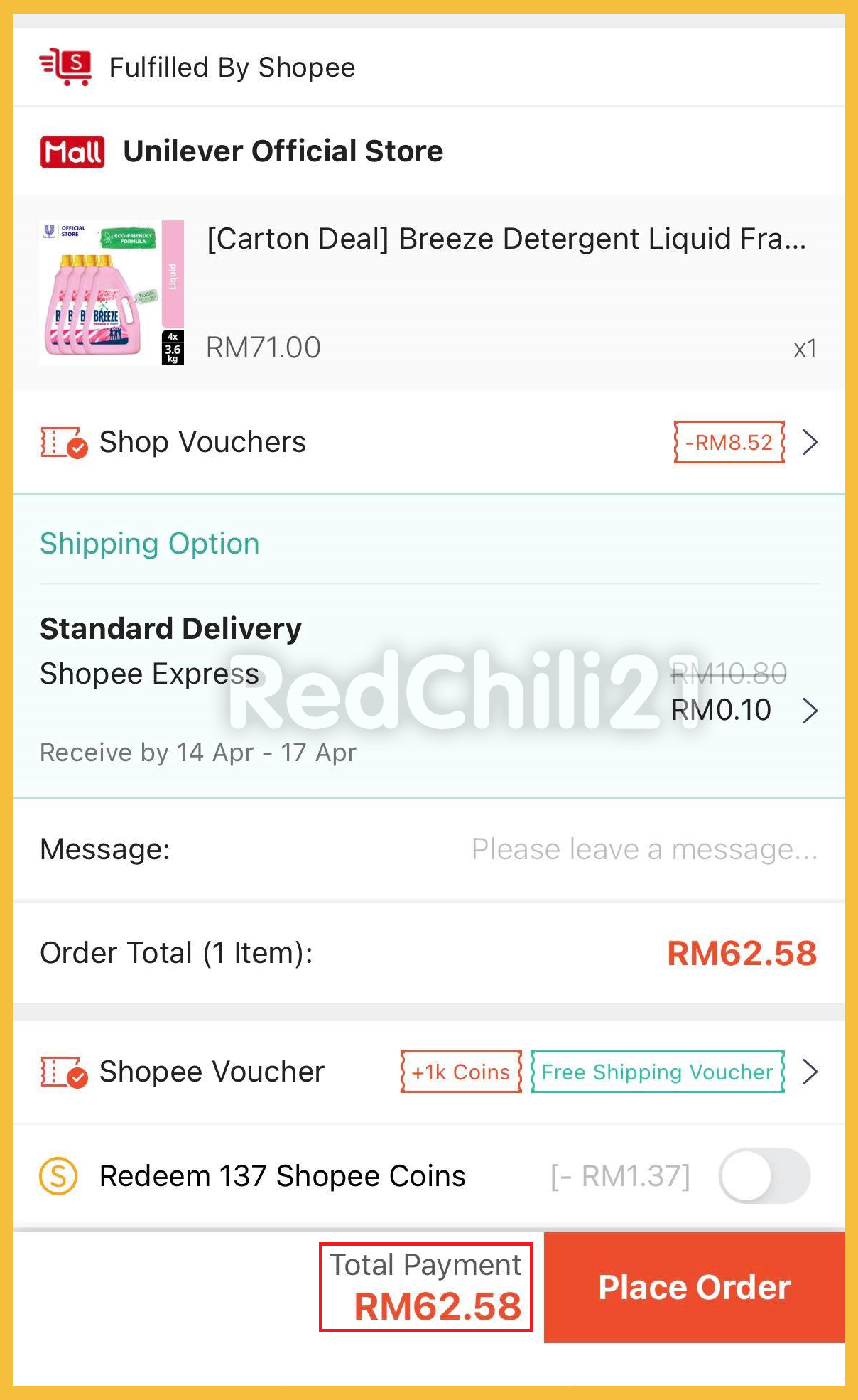 ※ RM71- RM8.52= RM62.58!再扣你领取的1000 coins (RM10) 也就是4罐洗衣液只需RM52.58!平均一罐洗衣液最低只需RM13.15!