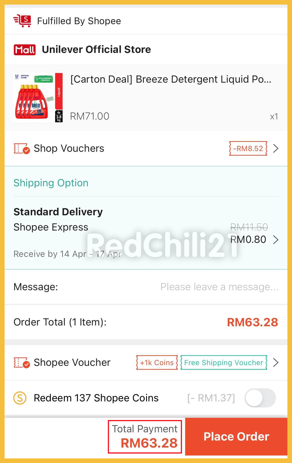 ※ RM71- RM8.52= RM63.28!再扣你领取的1000 coins (RM10) 也就是4罐洗衣液只需RM53.28!平均一罐洗衣液最低只需RM13.32!