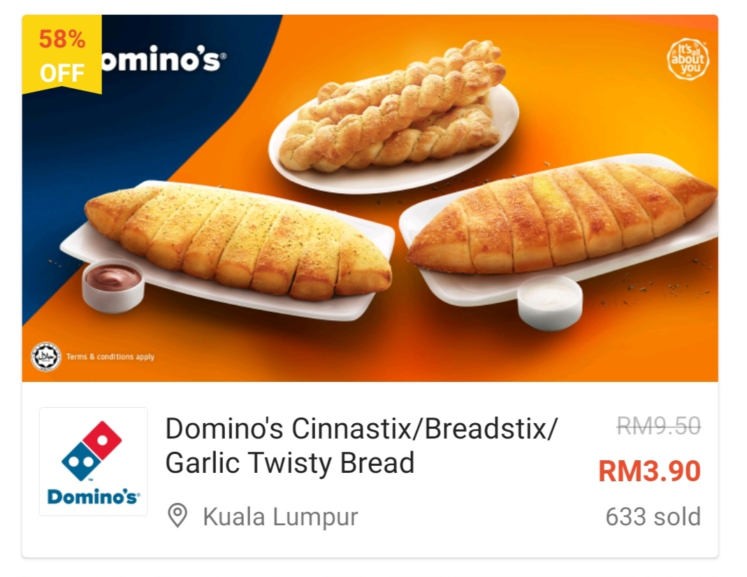 ① Domino’s Cinnastix/Breadstix/Garlic Twisty Bread —— 只需RM3.90(原价RM9.50)