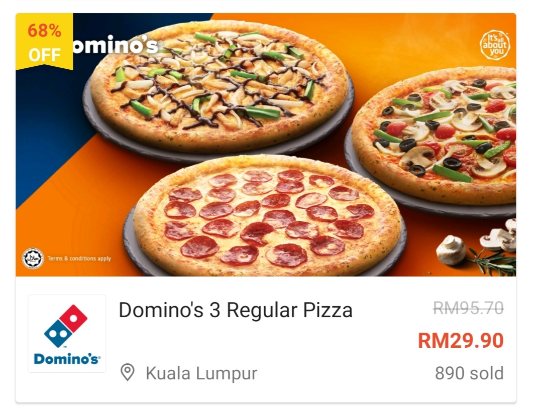 这项优惠是由Shopee 与Domino’s Pizza 联合推出超值优惠券!最低只需RM3.90!